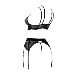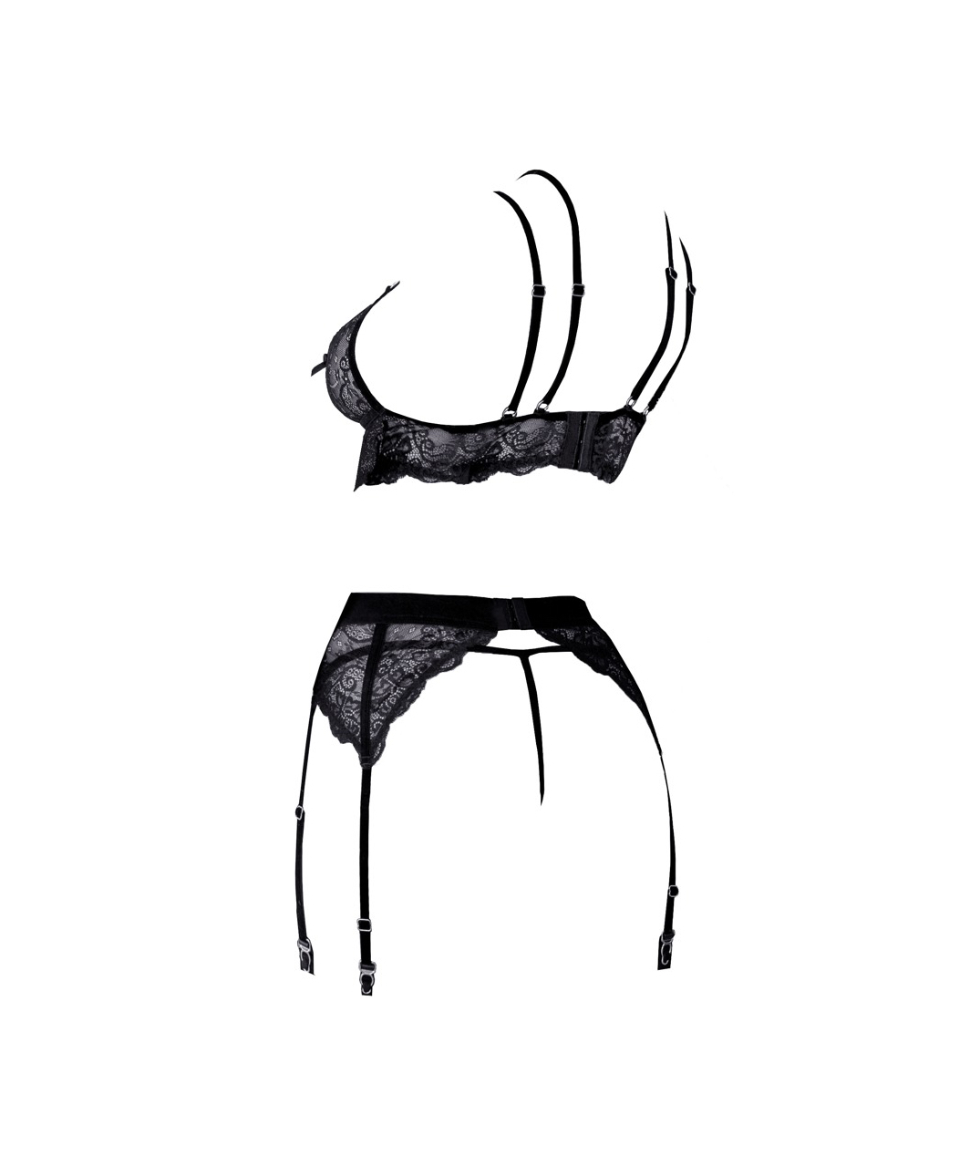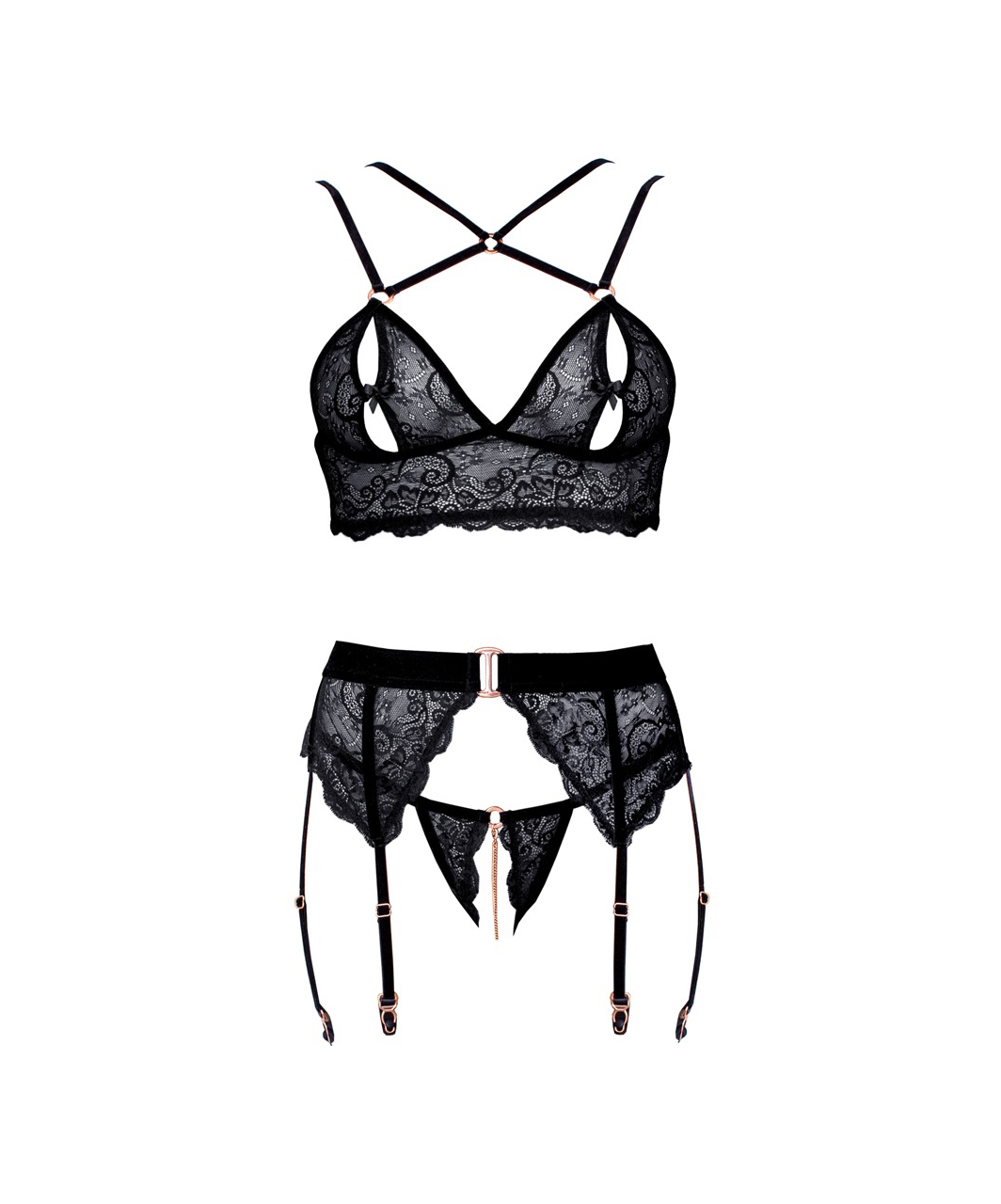 Peek-a-boo lingerie set made of fine black lace with rose gold coloured metal details.