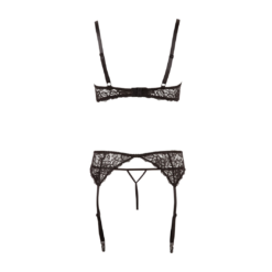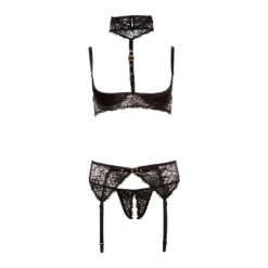 This 3-piece set has an underwired shelf bra, suspender belt and crotchless string. The majority of it is made of lace and the buckle straps in a fetish design give this outfit its extravagant touch. The choker can be fastened using the two buttons at the back and it is securely attached to the slightly padded underwired bra. Both the bra and suspender belt have a hook-fastener at the back. Bra and suspender straps are adjustable.