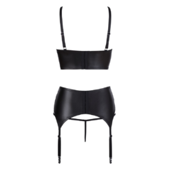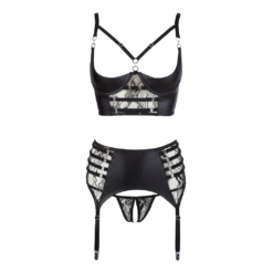 Three-piece suspender set with seductive details. The shelf bralette with slightly padded underwire cups perfectly emphasizes your breasts – sensually enclosed by delicate straps and beautiful ornamental rings in the cleavage area. The suspender belt and the inviting crotchless G string complete this erotic ensemble. The hook fasteners at the back and the adjustable bra straps provide high wearing comfort. The bralette and suspender belt has see-through inserts with shiny bicoloured floral embroidery and elaborate lacing. Suspender straps are adjustable. Without stockings.