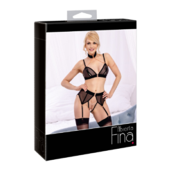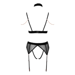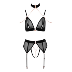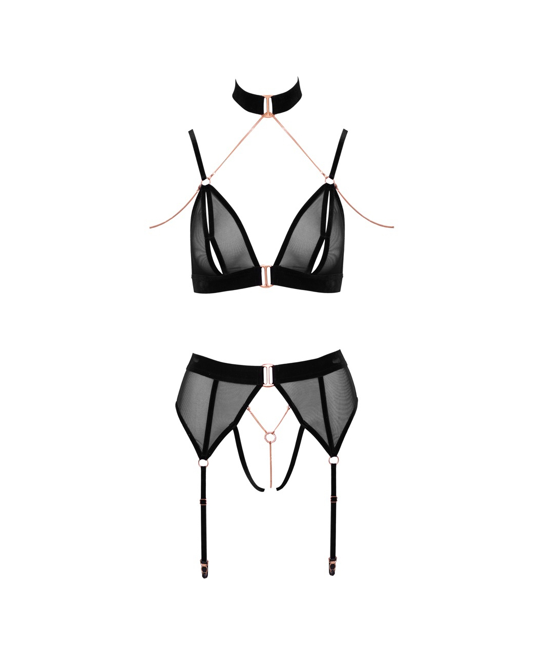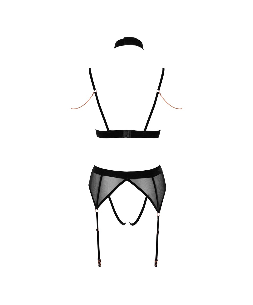 Black soft bra and crotchless suspender panties in a set made of stretchy sheer mesh with stylish velvet details and rose gold coloured metal chains and buckles. The bra has slitted cups and adjustable hook and eye closure at the back. The set is completed with velvet choker. The shoulder straps and suspenders are adjustable. All the chains are detachable.