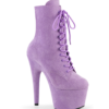 Lingerie set made of purple satin and black lace. The set includes slightly padded underwire shelf bralette with wide straps and crotchless panties with four detachable garters. Both pieces are adorned with a rose gold coloured metal chains that also are removable. The bralette has adjustable hook fastener at the back and adjustable straps. Without stockings.