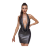 Sexy festive black net crotchless bodysuit with laced up sides in skinny red ribbons, extra high cut leg and scooped out back. Features a gold-coloured rings and double elastic G-string.