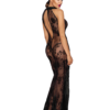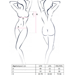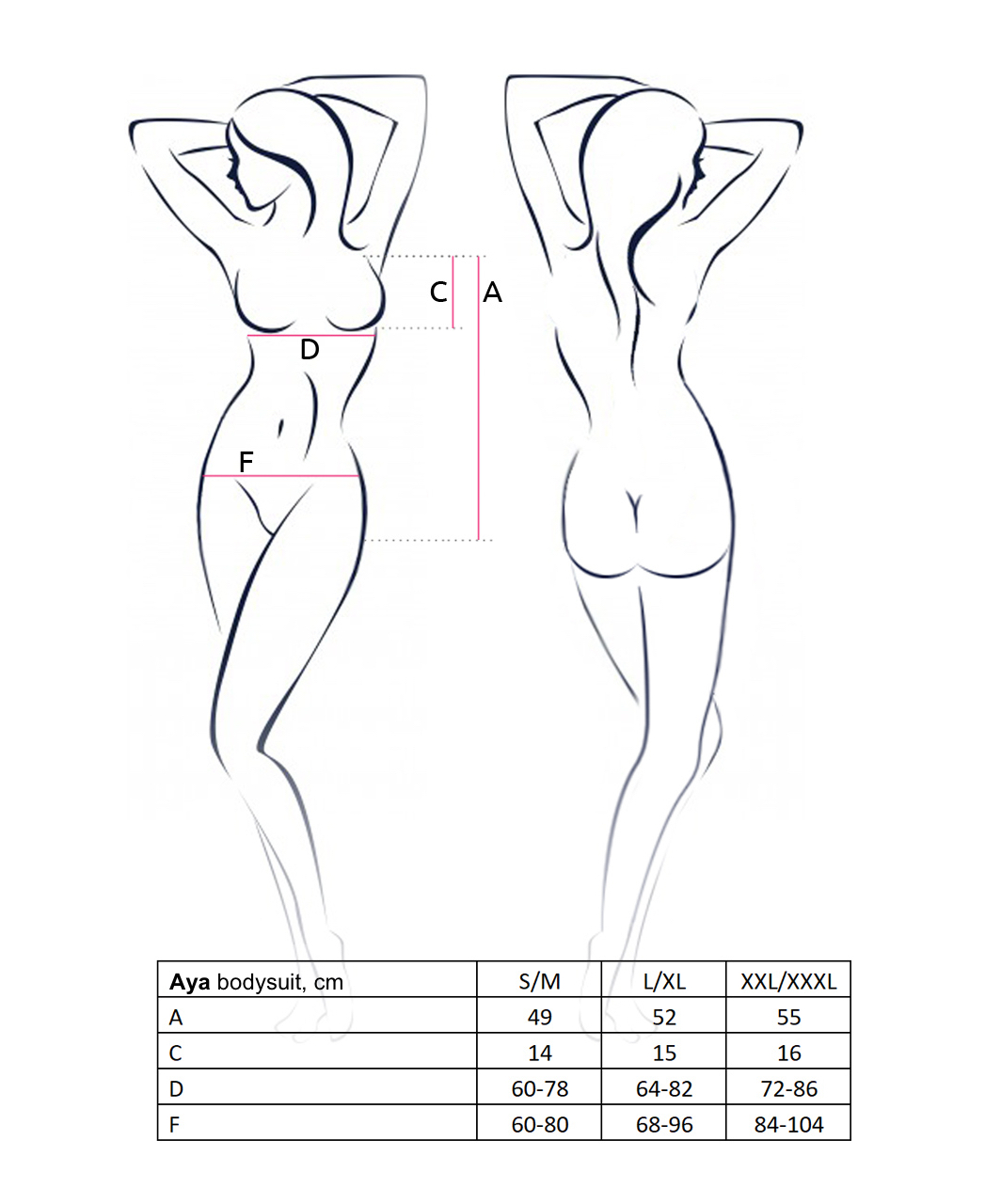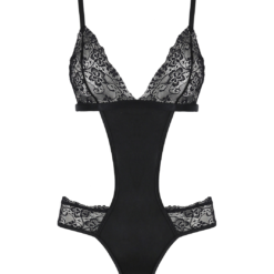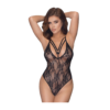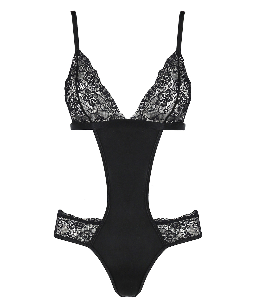 Black lace bodysuit with an open back, decorative straps in the back and satin inserts. The back has three-row hook closure. The length of the straps are easily adjusted.