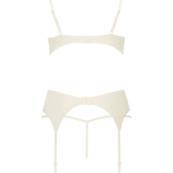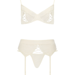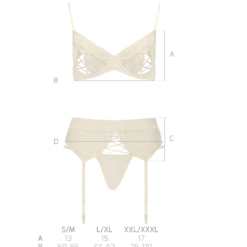 An ecru lingerie set with an underwire bra, suspenders and thong. The front is decorated with seductive lacing. The length of the straps can be easily adjusted. The bra and suspenders have three-row hook and loop closure on the back.