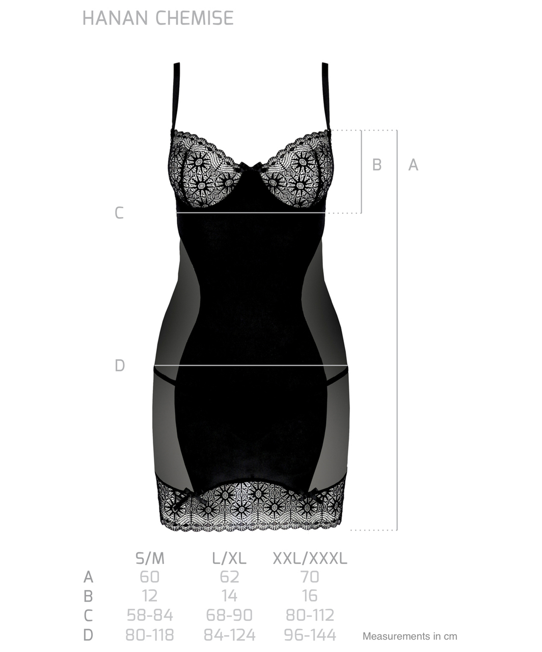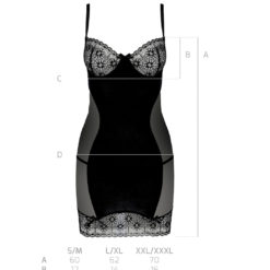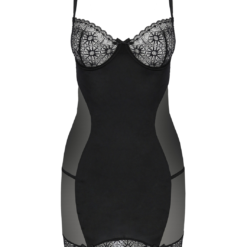 Black satin chemise with mesh and lace details. Bra part has a supporting underwire. The length of the straps can be easily adjusted. Complete with matching thong.