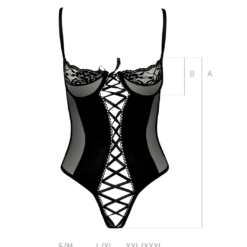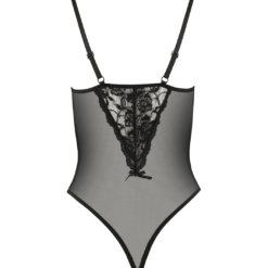 Black sheer mesh bodysuit with satin inserts and a lacing in the front. With supporting underwire; the length of the straps are easily adjusted.