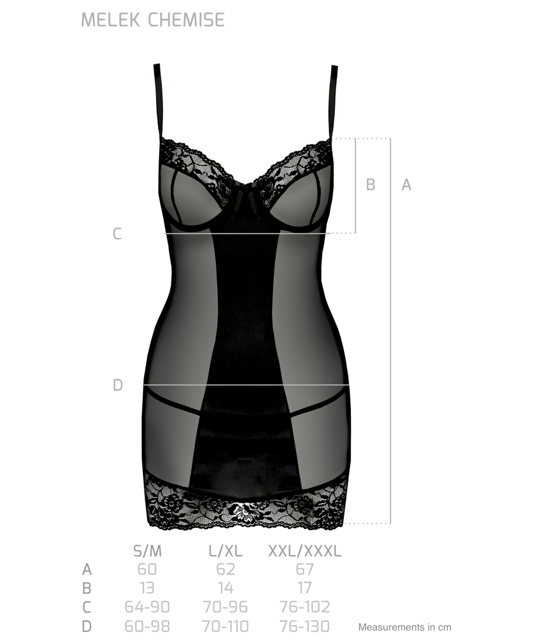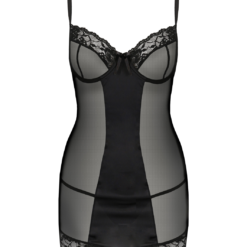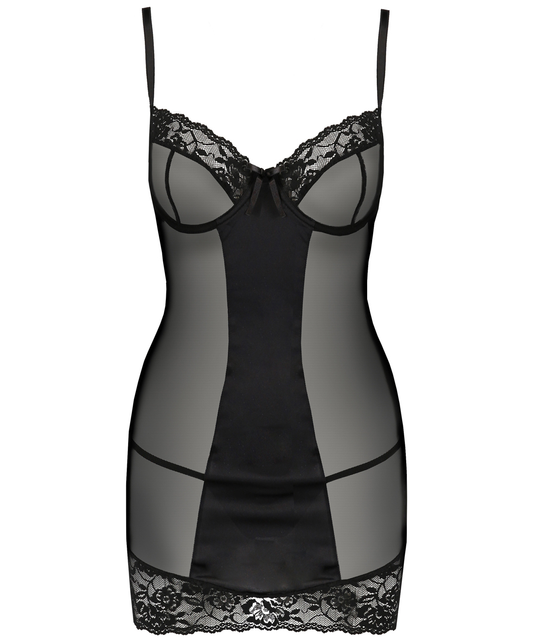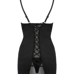 Black satin chemise with mesh and lace details and decorative lacing on the back; with supporting underwire. The length of the straps can be easily adjusted. Complete with matching thong.