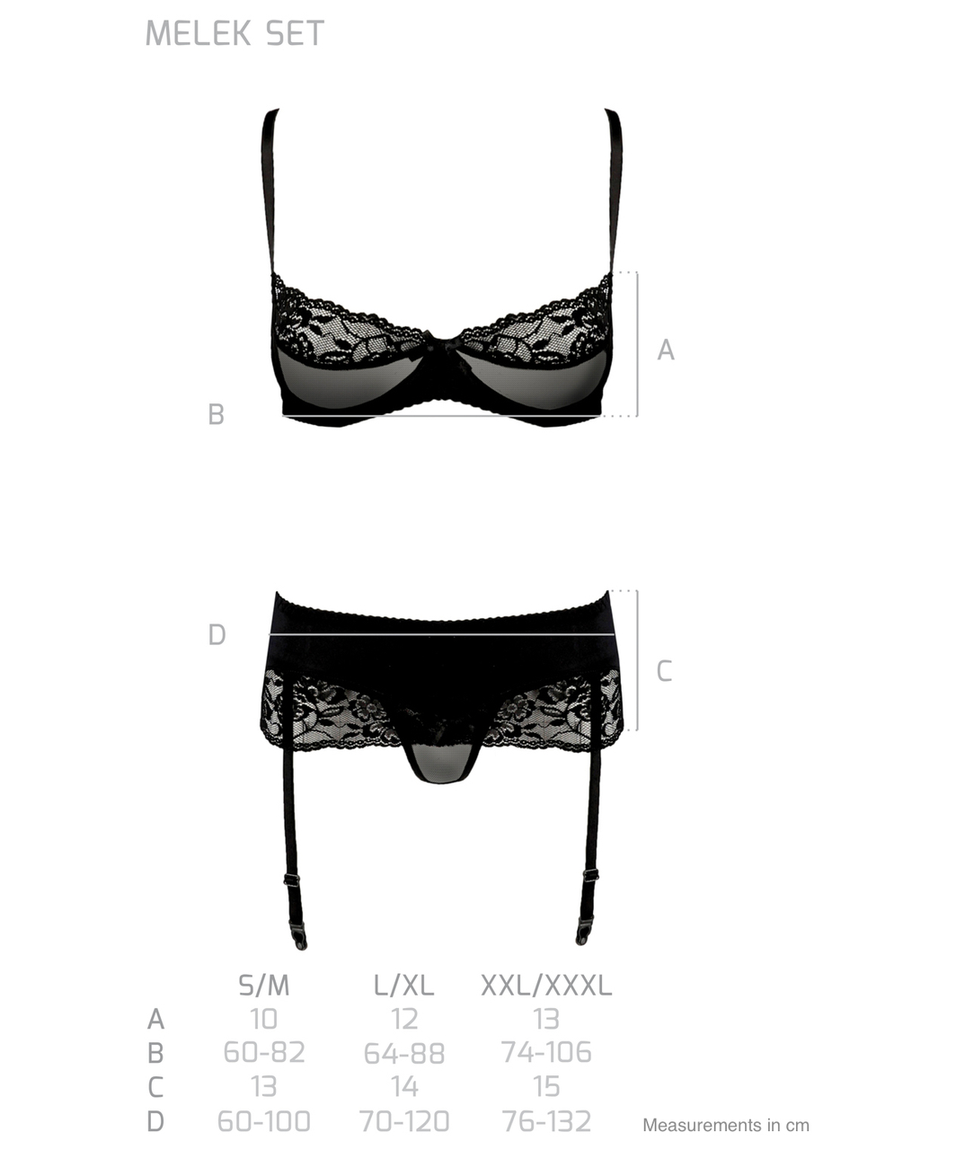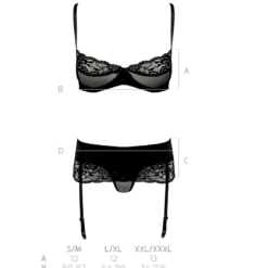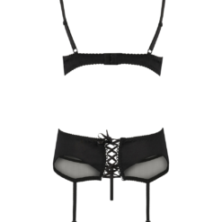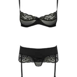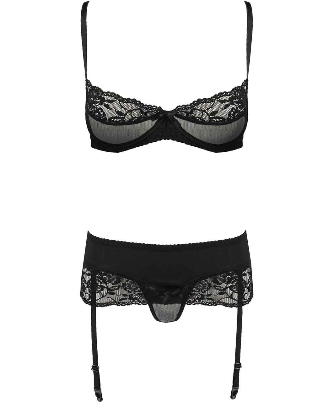 Black satin and sheer lace lingerie set with underwire bra, suspender belt and a G-sting. The bra has adjustable hook and eye back closure. The garter belt has back lacing. Straps and suspenders are adjustable.
