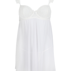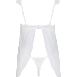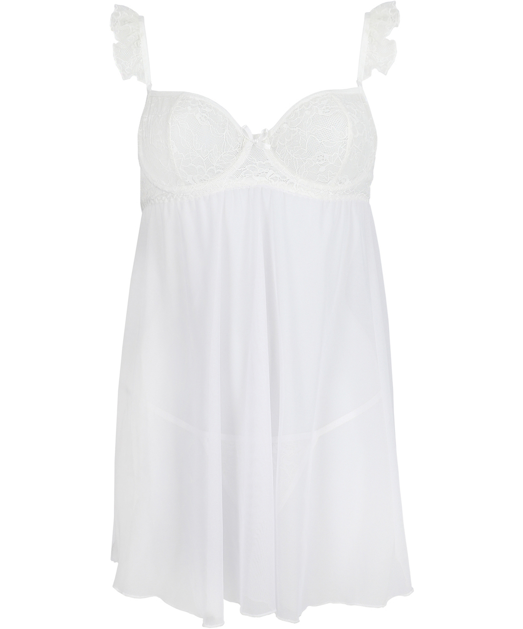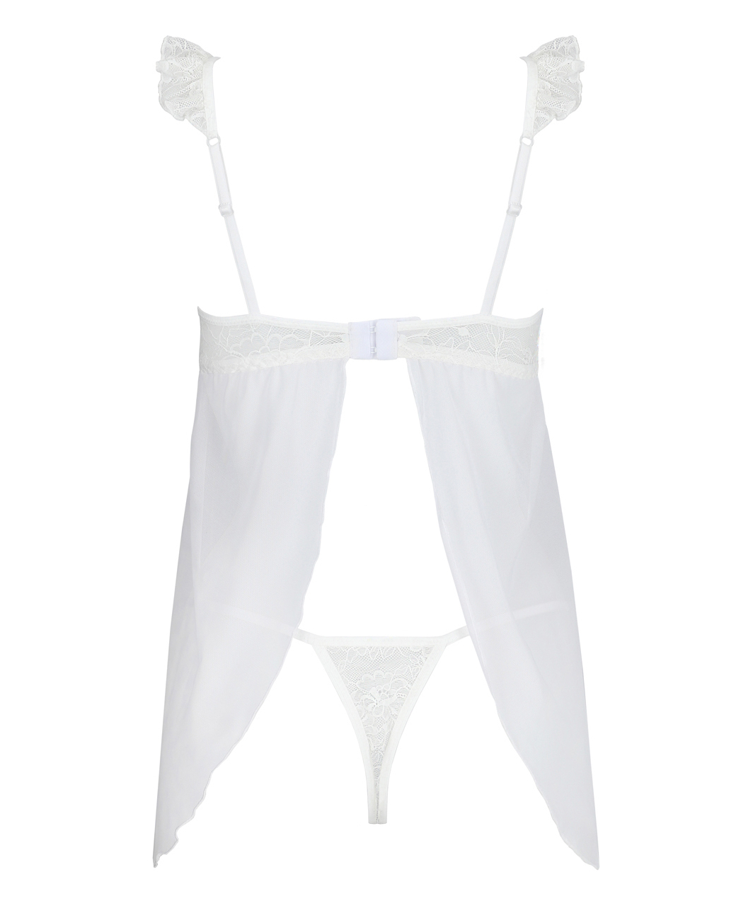 Sheer white mesh babydoll with a lace bra and straps with frills. The bra is underwired and the back is open with a three-row hook closure. Matching thong included.