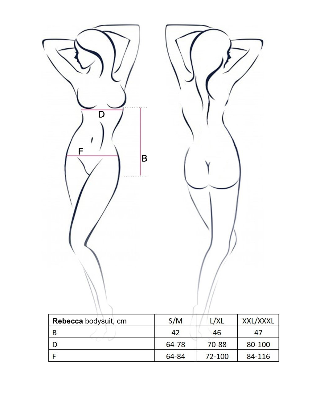 Black bodysuit with sheer mesh and satin inserts and a shelf bra with underwire. The back has a three-row hook closure. The length of the straps can be easily adjusted.