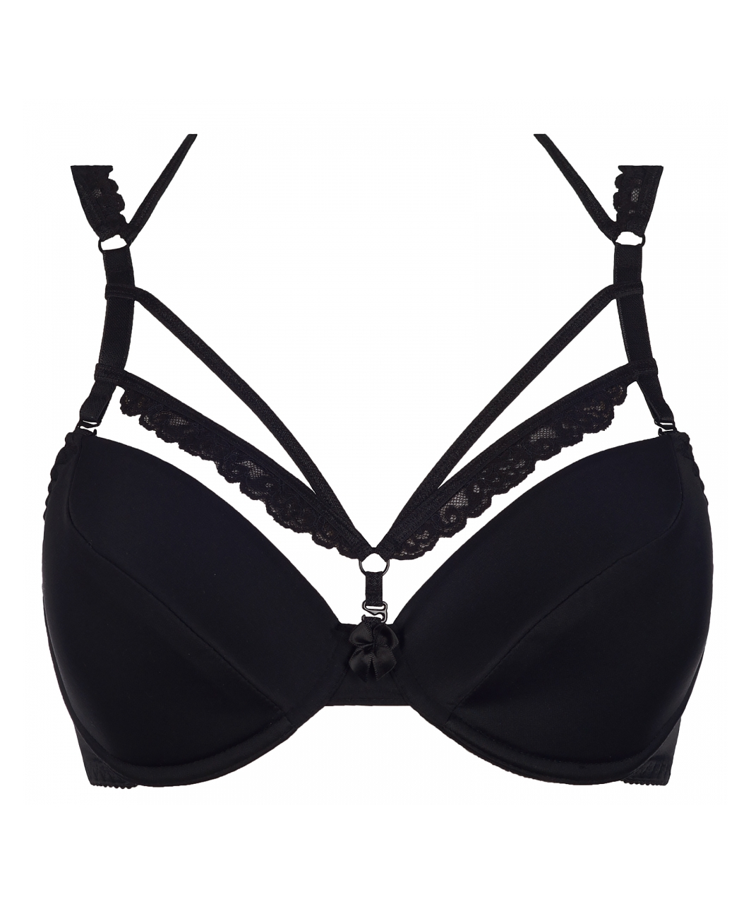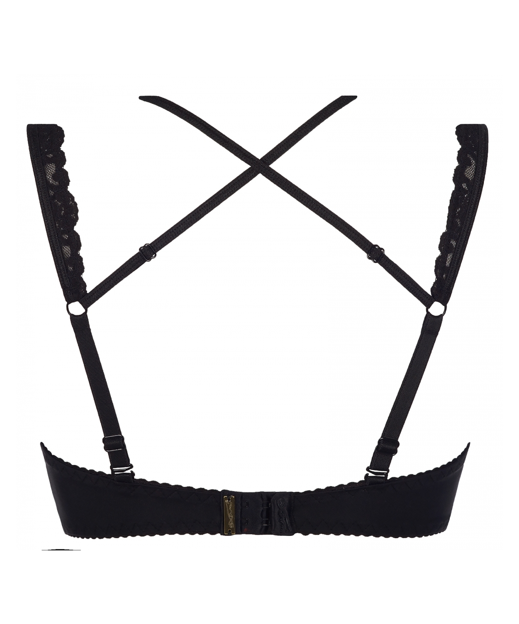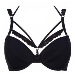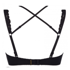 Venetian Mirror collection black bra with support wires and padded cups, elastic straps on the front, decorated with lace. Shoulder straps are also decorated with lace. The length of the straps are easily adjustable. The bra has a two-row hook fastening on the back (variable circumference).