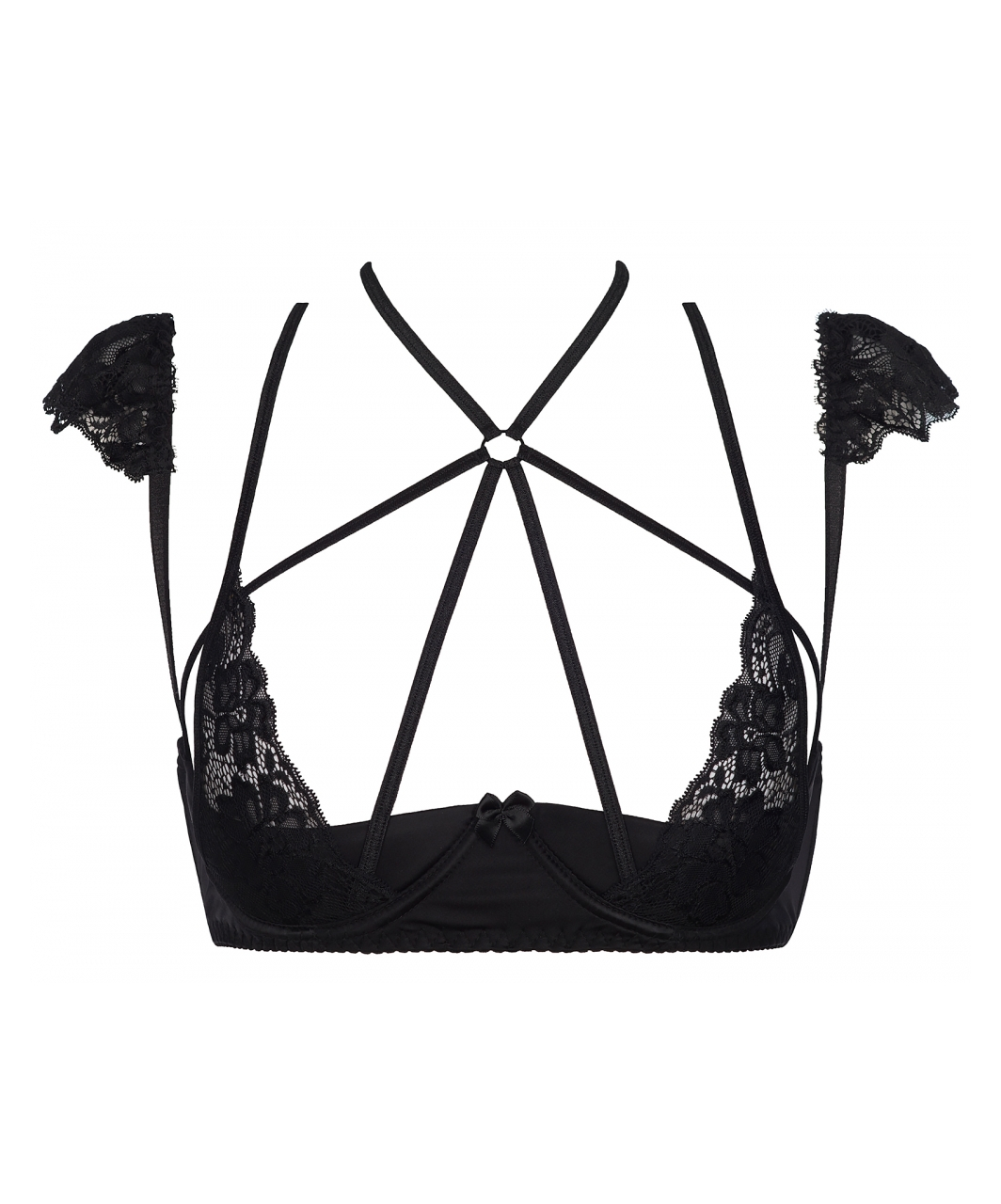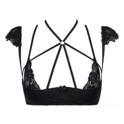Fruit Garden collection black bra with elastic straps in the front, support straps and half cups, covered with floral pattern lace flaps that ties around the neck. Shoulder straps are decorated with lace ruffles. The length of the straps are easily adjustable. The bra has a two-row hook fastening on the back (variable circumference).
