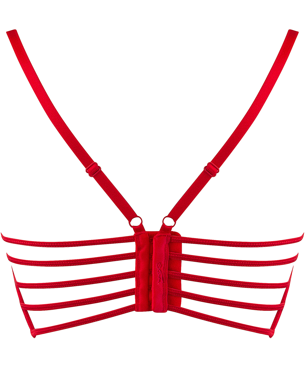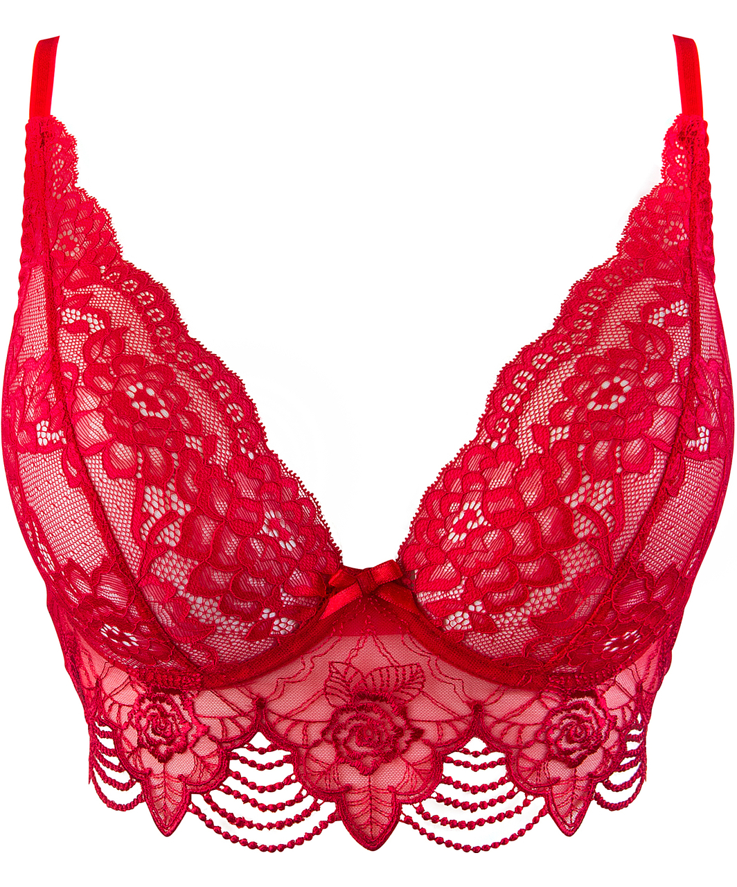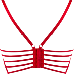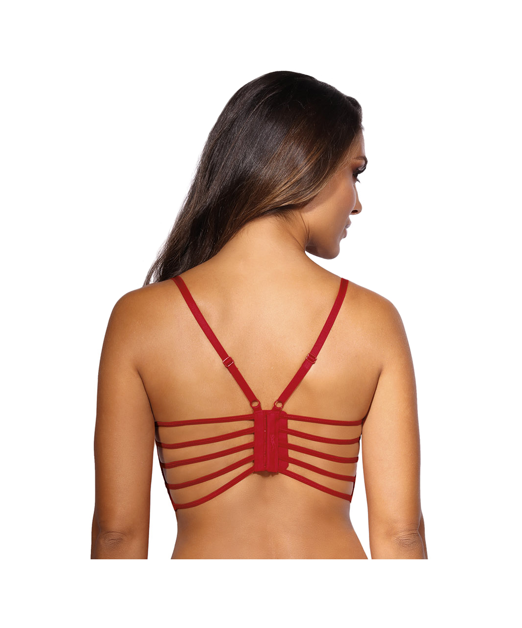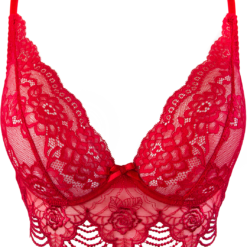 Red lace strappy bralette with floral embroidery and underwire cups. Adjustable straps and hook and eye back closure.