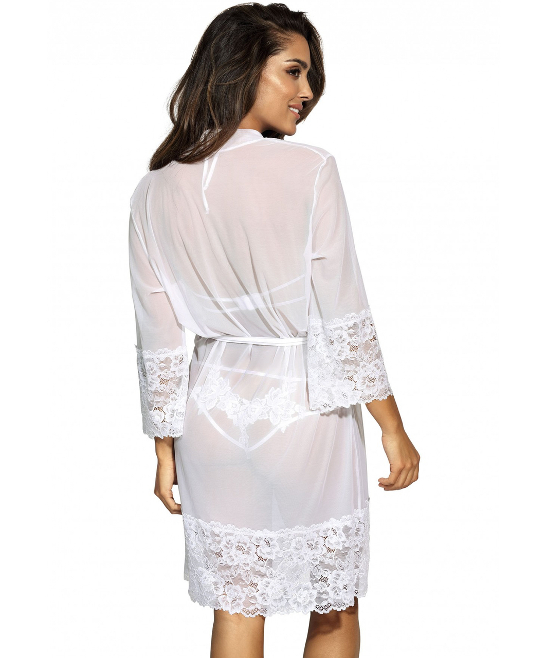 Sheer and soft, long dressing gown with floral pattern lace trim and self tie belt. Unisize (S-L). Without bra and panties.