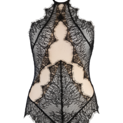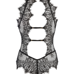 Black see-through eyelash lace bodysuit with front cutouts and tulle inserts. Adjustable back straps with hook closures.