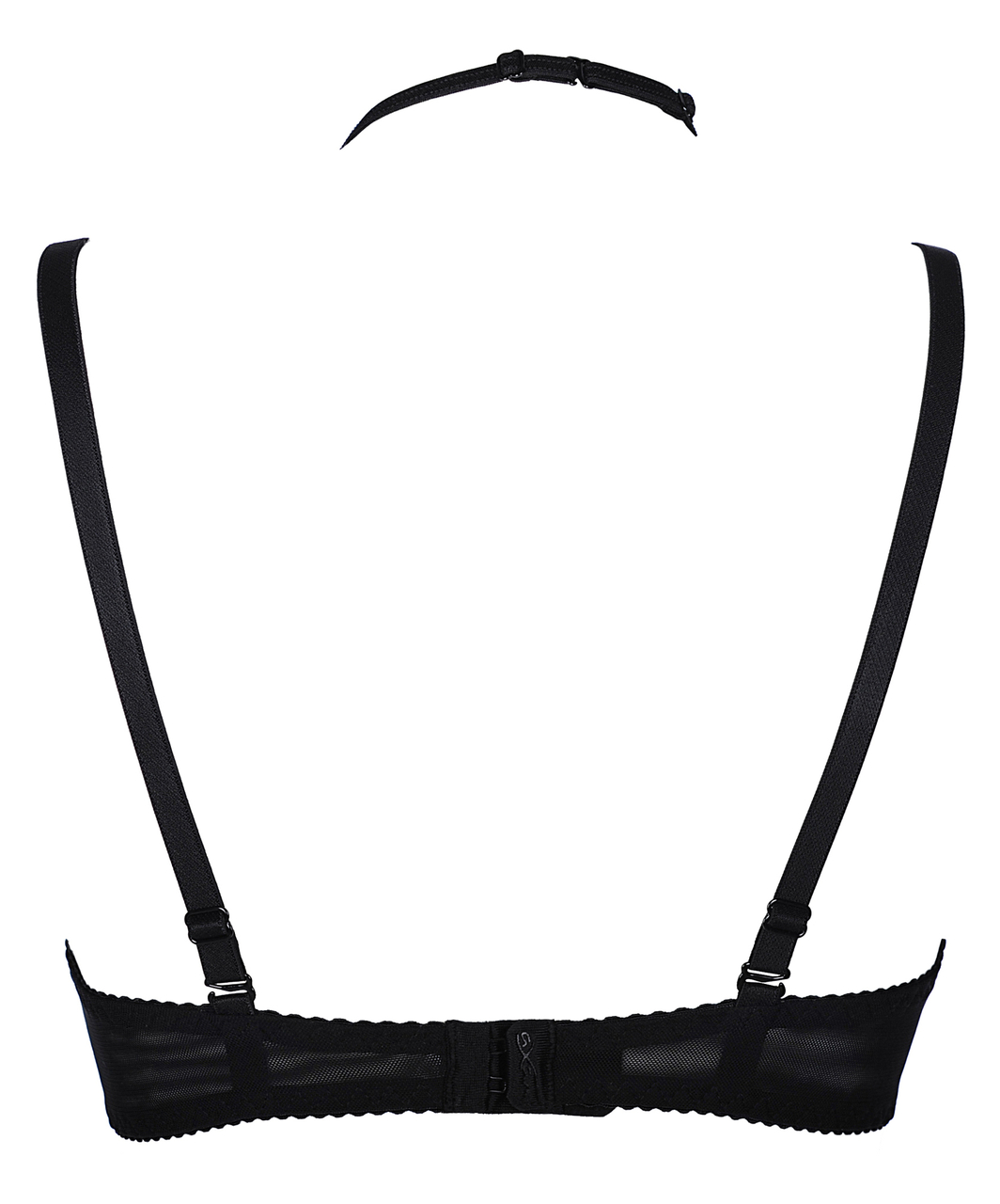 Black lace push up bra with beige lining inside the underwire cups. The padding is removable. Tulle insert with tattoo pattern hold together chest and neck straps, neck straps are adjustable. All straps are removable. Adjustable hook closure on the back.