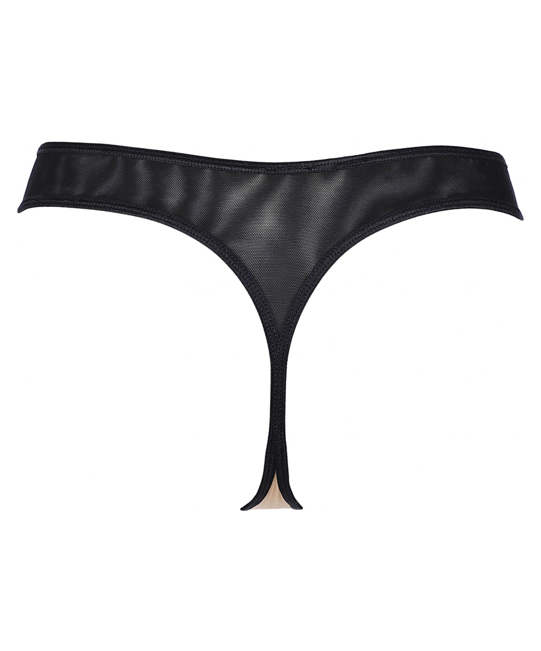Black string with cutouts and tulle insert with tattoo pattern in the front.