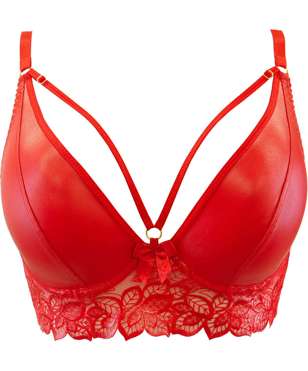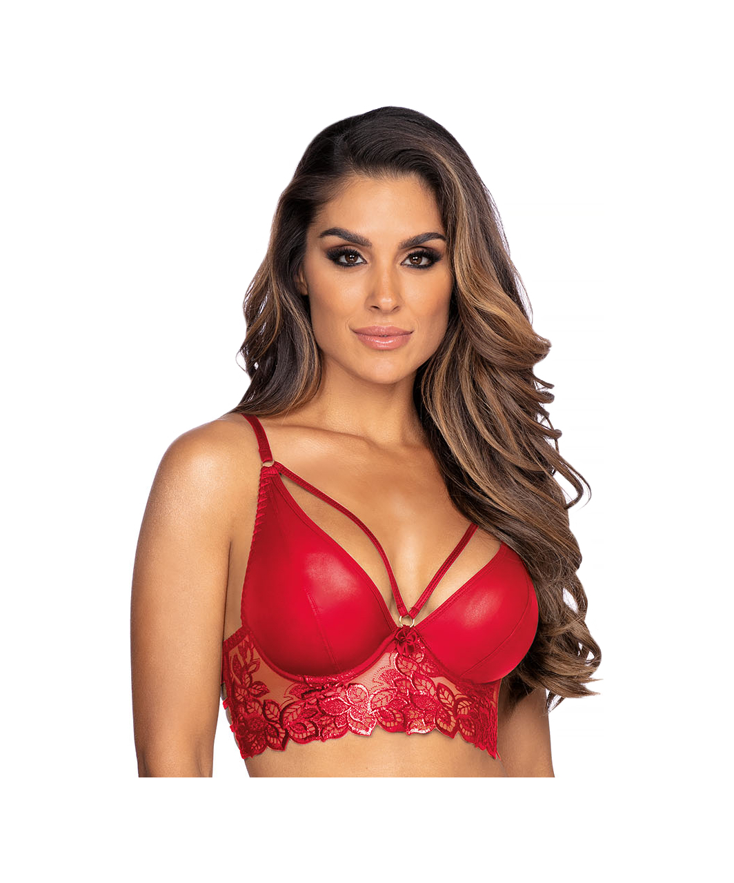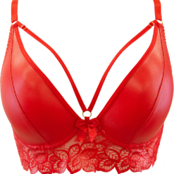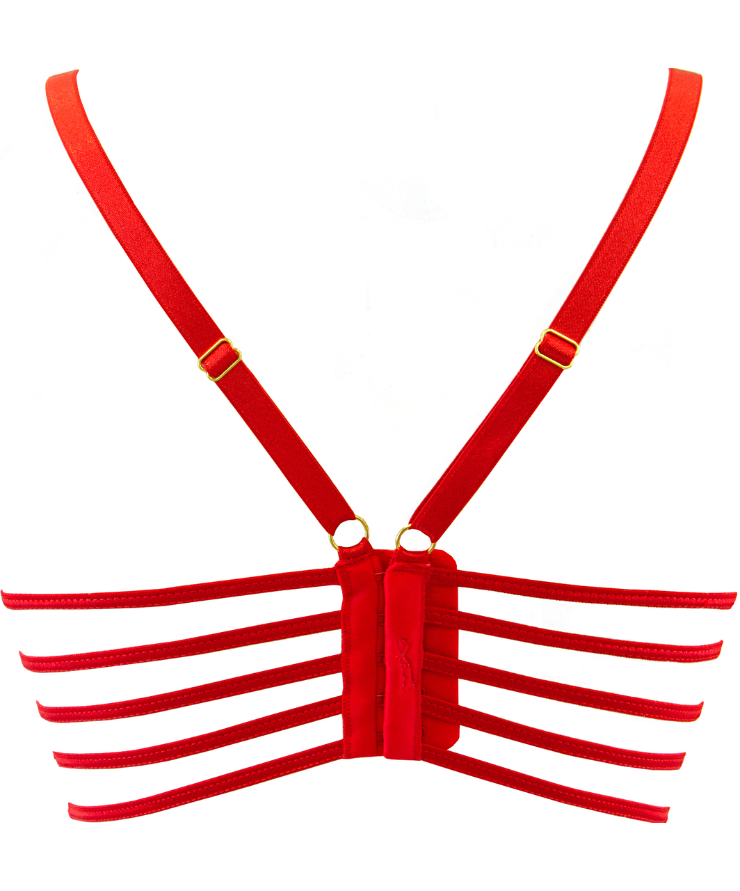 Red strappy bralette with floral embroidery and underwire cups made with polyurethane coating. Adjustable straps and hook and eye back closure.