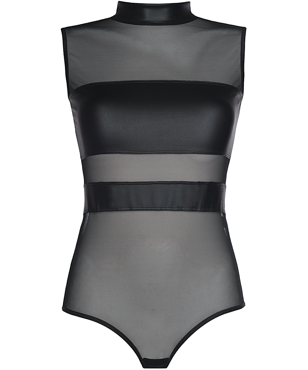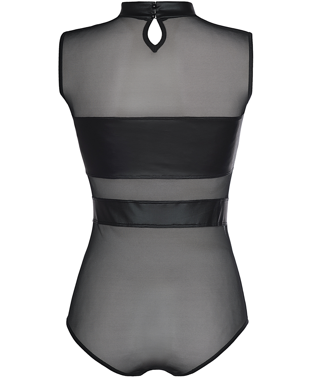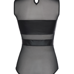 Black sheer mesh sleeveless bodysuit with matte look inserts.