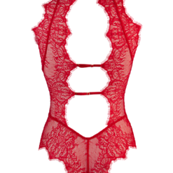 Red see-through eyelash lace bodysuit with front cutouts and tulle inserts. Adjustable back straps with hook closures.