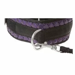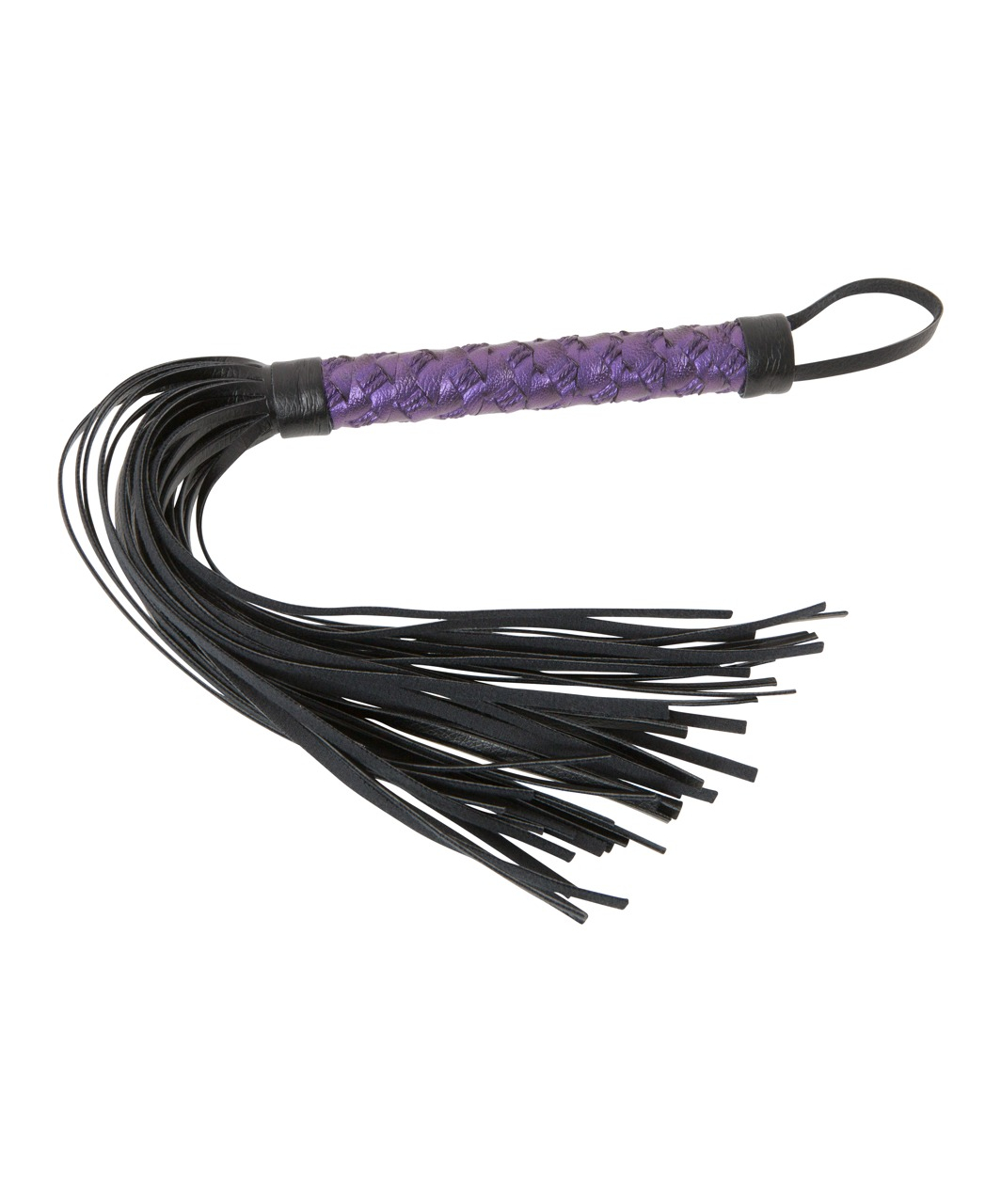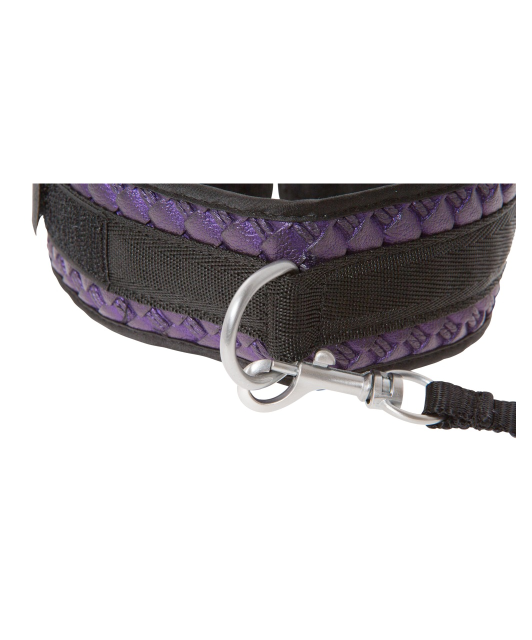 Black/purple bondage set which include the handcuffs, collar and a leash, and a mini flogger (complete length 38 cm). The restraints have a weaved pattern on the outside and soft plush padding inside. The restraints also have hook and loop fasteners. The collar is 5.5 cm wide and the handcuffs are 7.5 cm wide. The snap hook attaches the leash (110 cm) to the D-ring on the collar. The handcuffs are joined together by a connection strap with 2 snap hooks. Polyurethane, metal.
