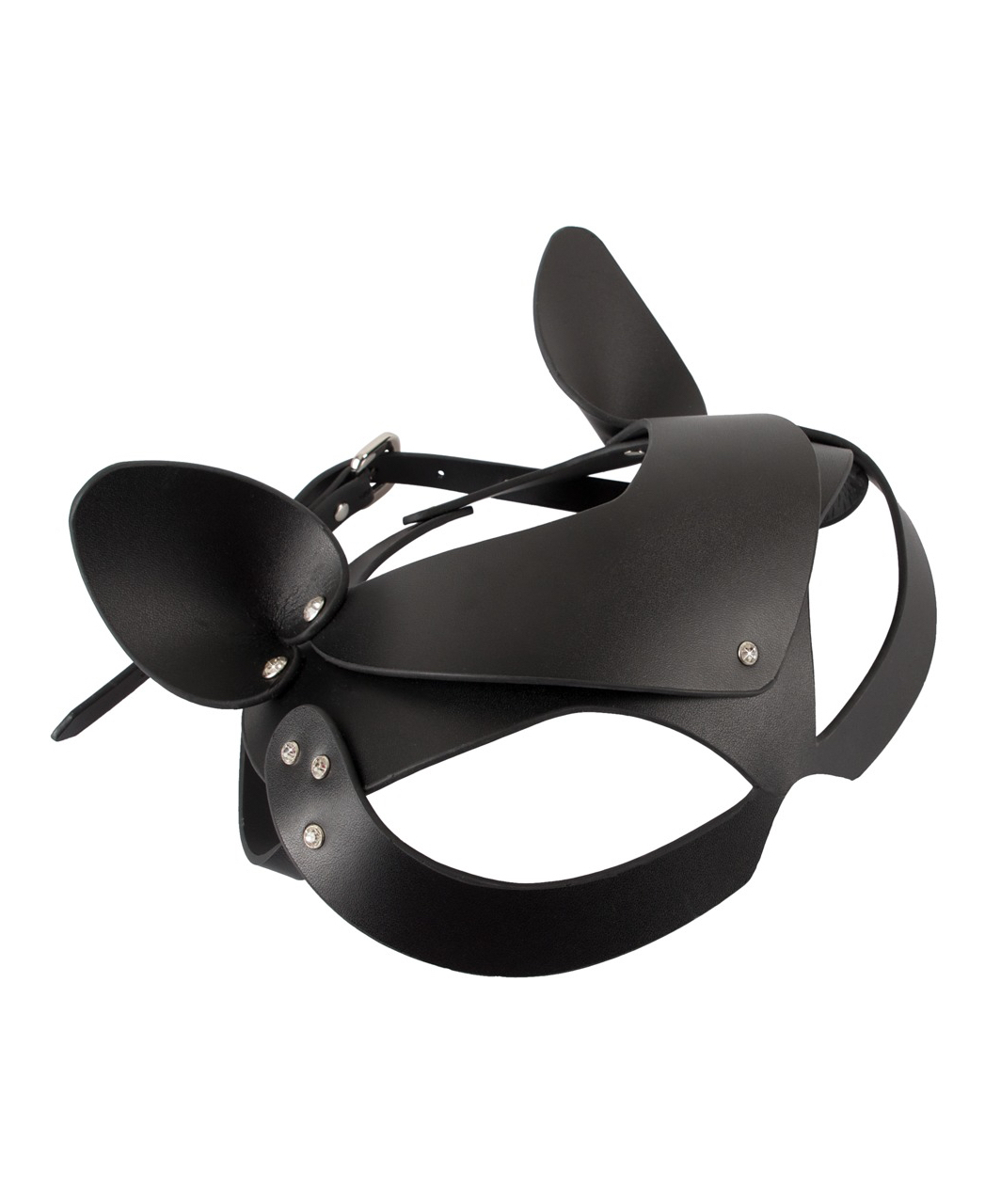 Sturdy leather-look head mask with cat ears and miniature rhinestone rivets – a purrfect accessory for an exciting role play. With press studs and buckle fastener at the back for an ideal fit. Unisize. Without collar.