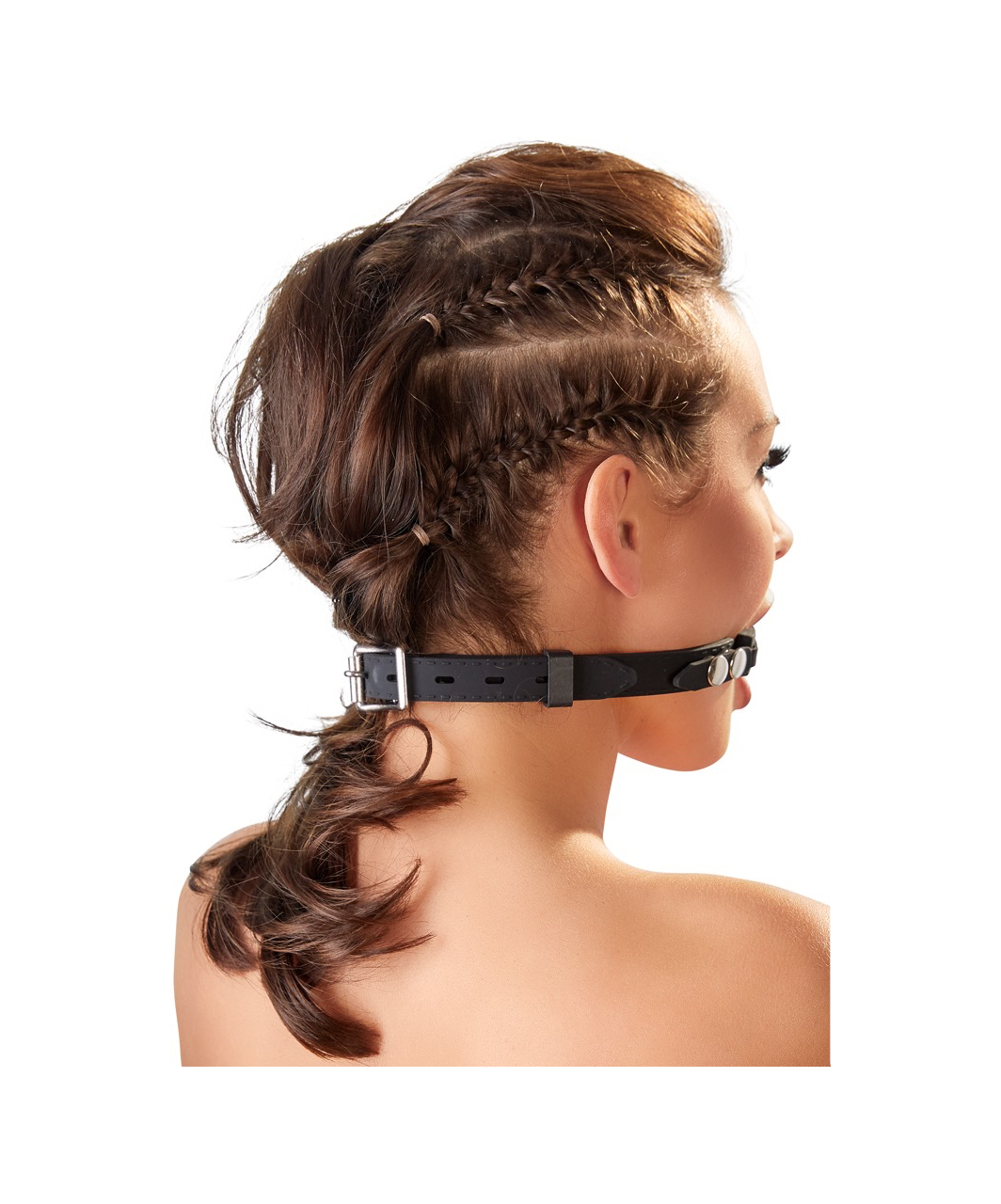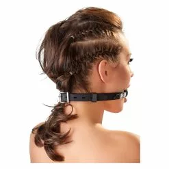 Black dotted ball gag (Ø 3.8 cm) on an adjustable (circumference up to 51 cm) strap, both made of smooth silicone. Metal buckle with locking tongue that allow you to use small padlock (not included).