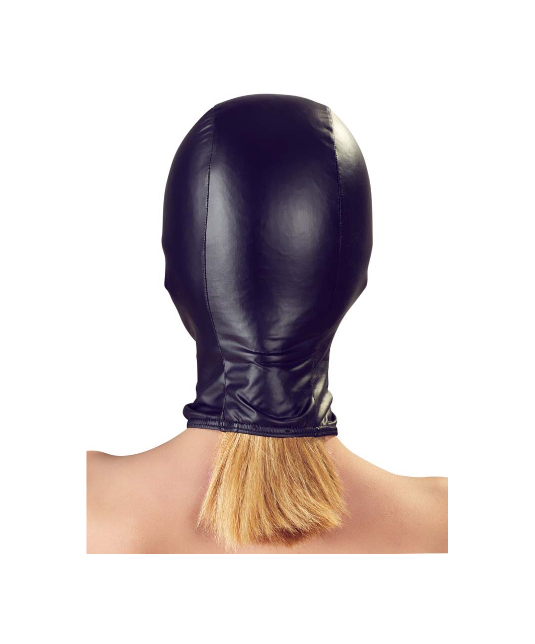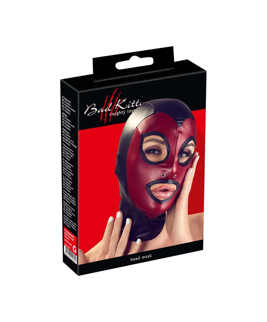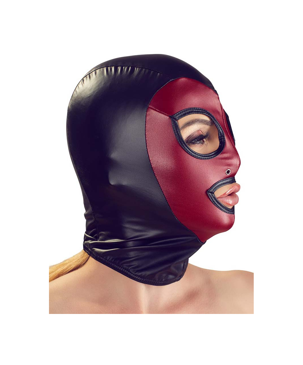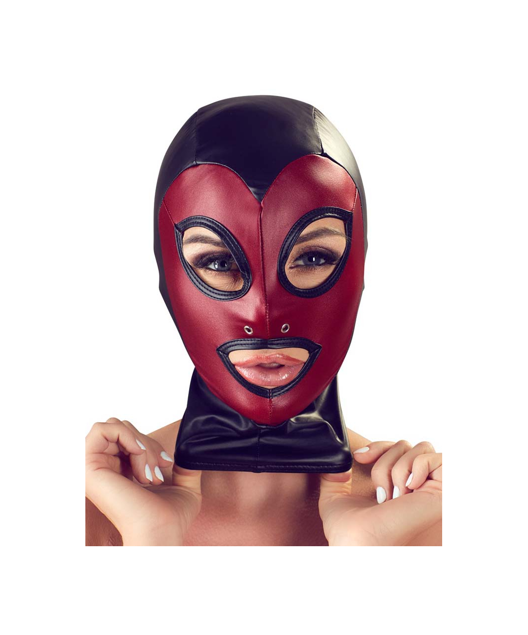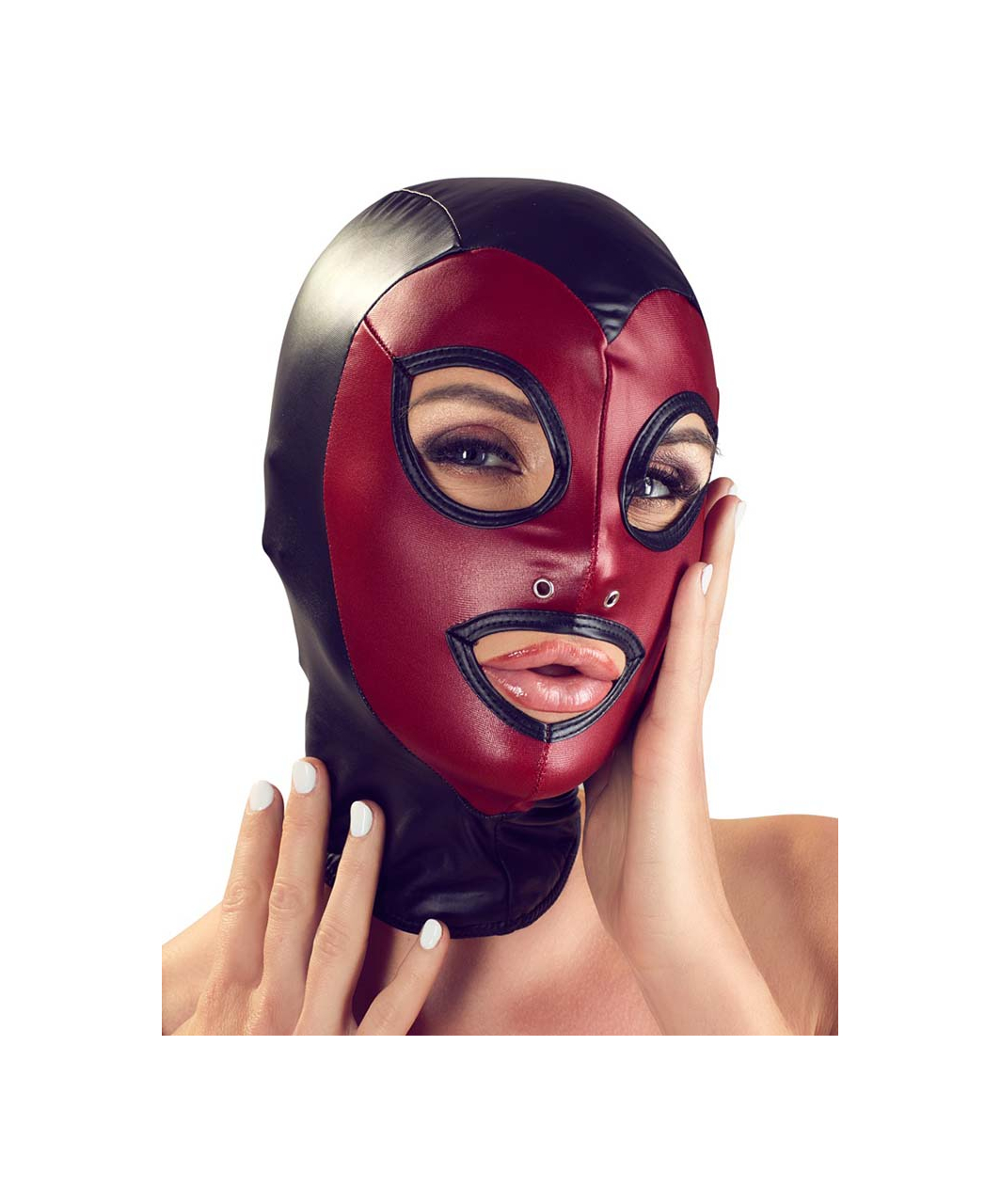 Stretchy head mask that fits like a second skin. The mask is black except for the material over the face which is red. With large black holes around the eyes and mouth. The holes are decorated with piping. There are eyelets for the nostrils.