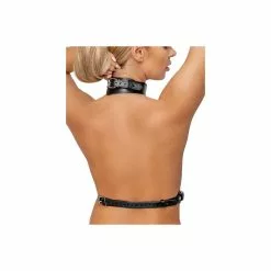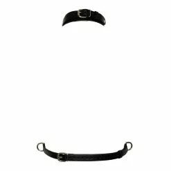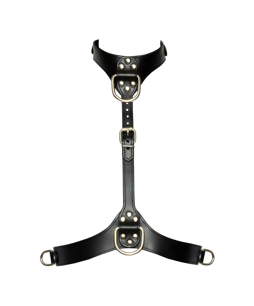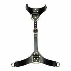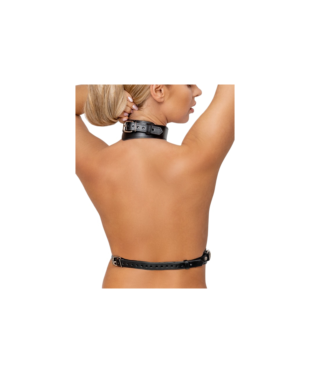 Black leatherette harness with collar and massive D rings. Adjustable with buckle closures.