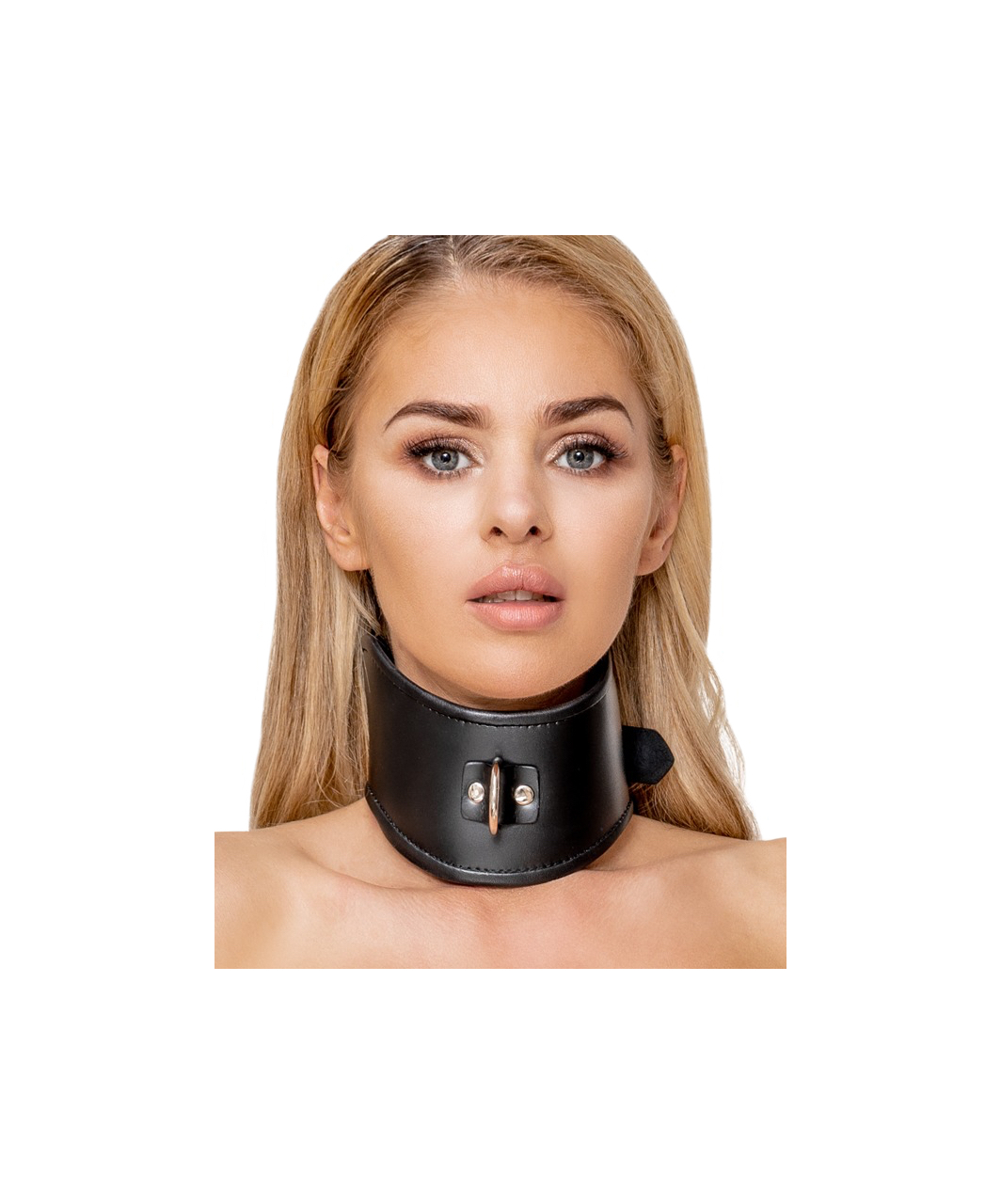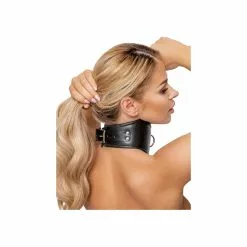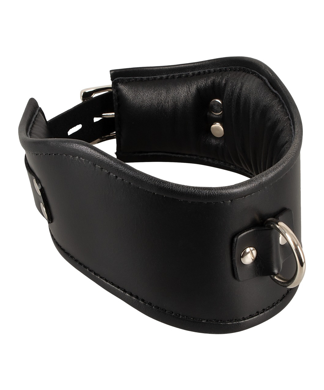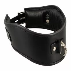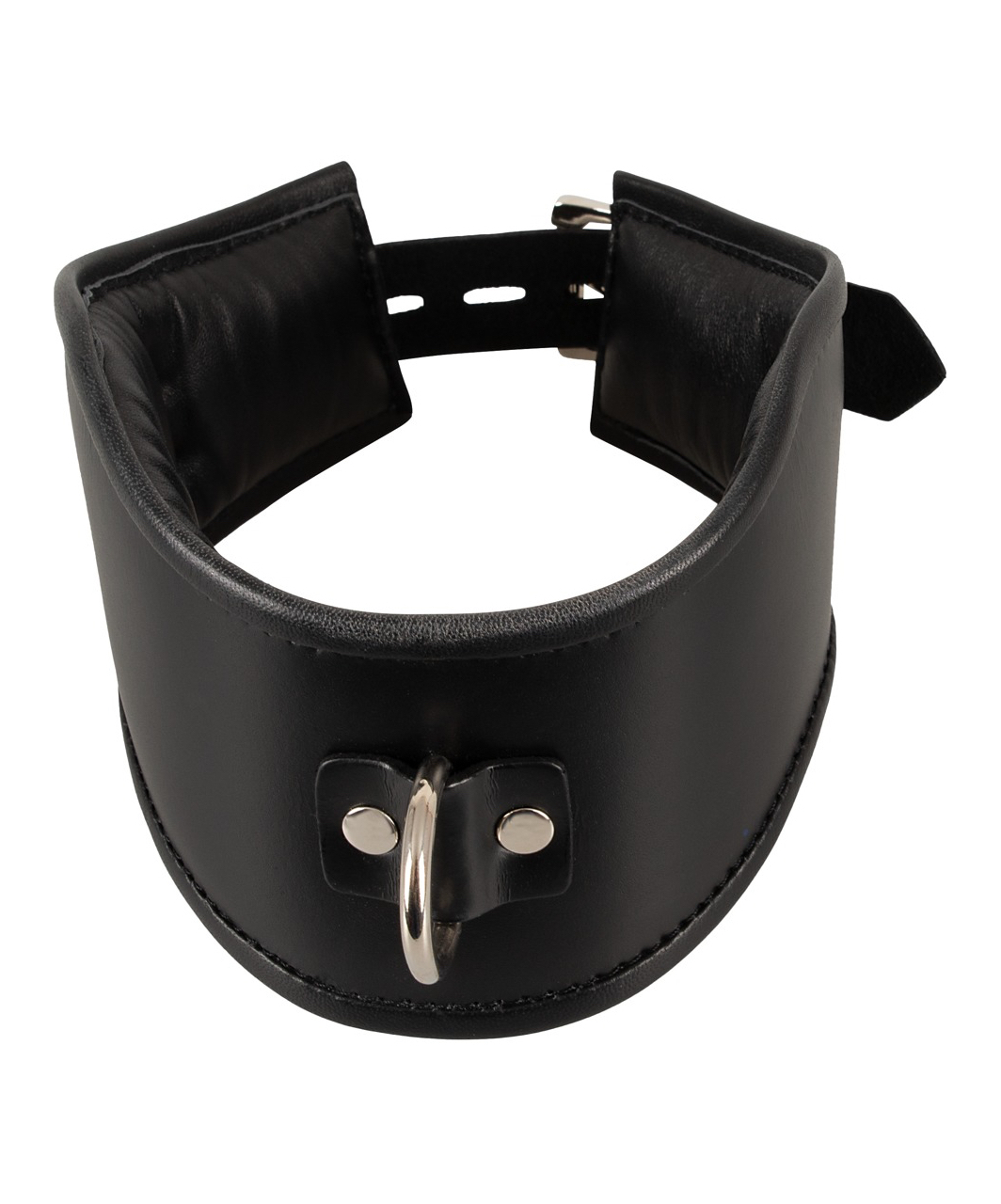 Black wide contour collar with D ring and buckle closure which allows you to use a padlock (not included). Padded, made of faux leather.