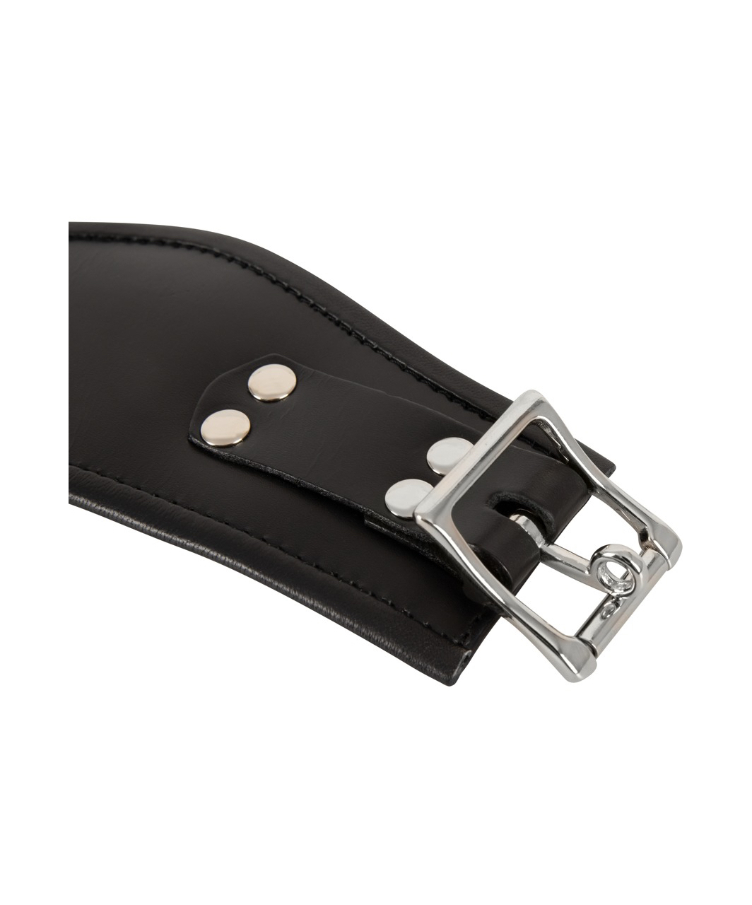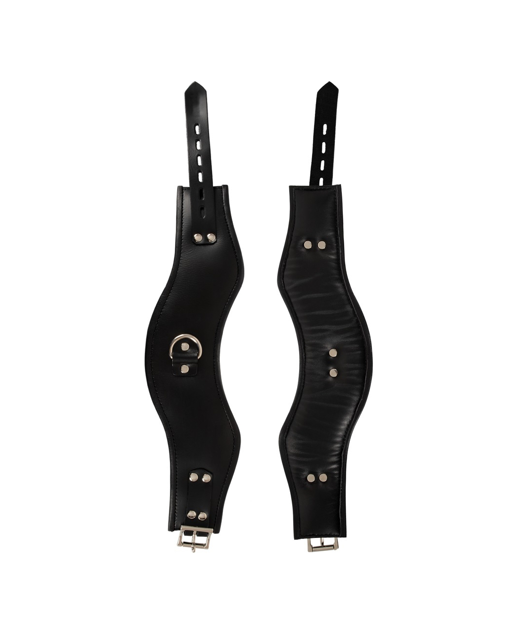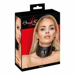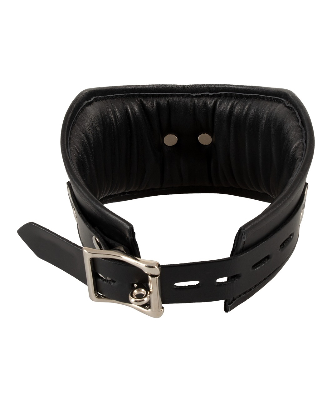 Black wide contour collar with D ring and buckle closure which allows you to use a padlock (not included). Padded, made of faux leather.