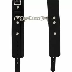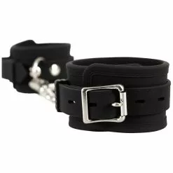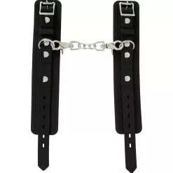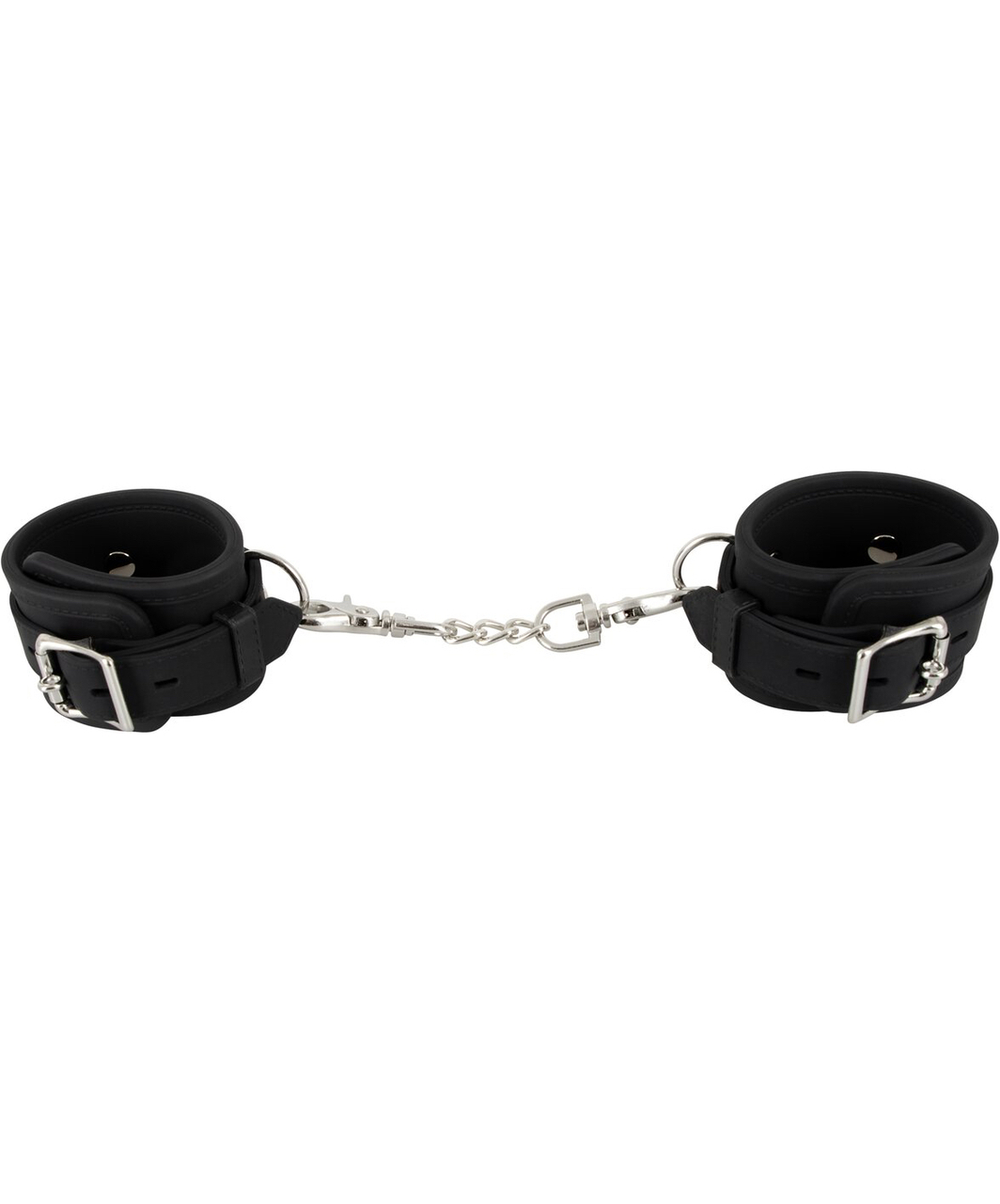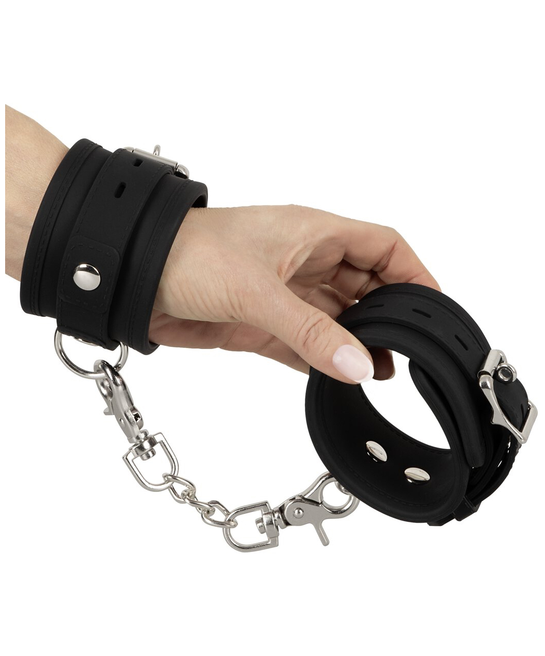 Adjustable sturdy hand cuffs with riveted straps. Length of connection chain, snap hooks included: approx. 18 cm. Black. Material: silicone, metal.