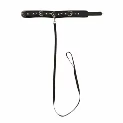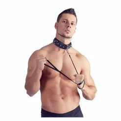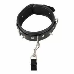 Black padded collar with a metal spikes and three D-rings on a removable leash. Circumference of a collar 37-47 cm, leash 112 cm long. Material: PU leather, polyester, metal.