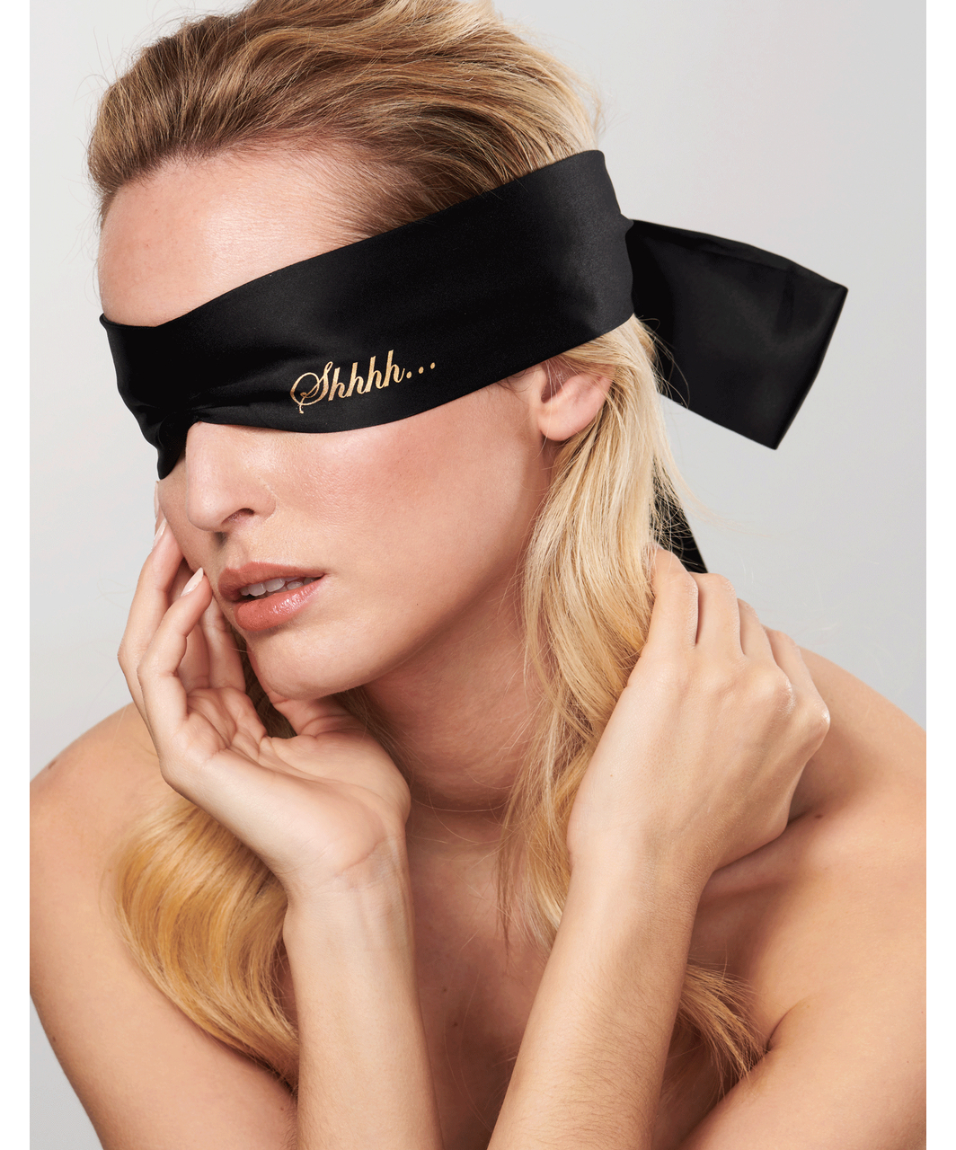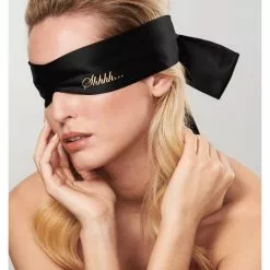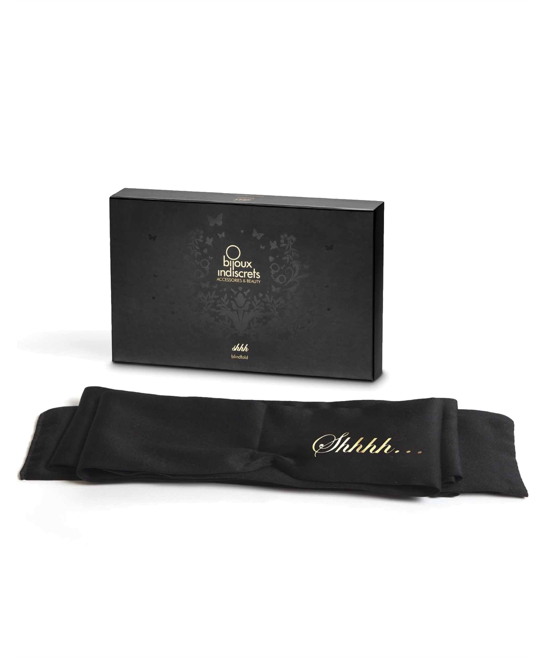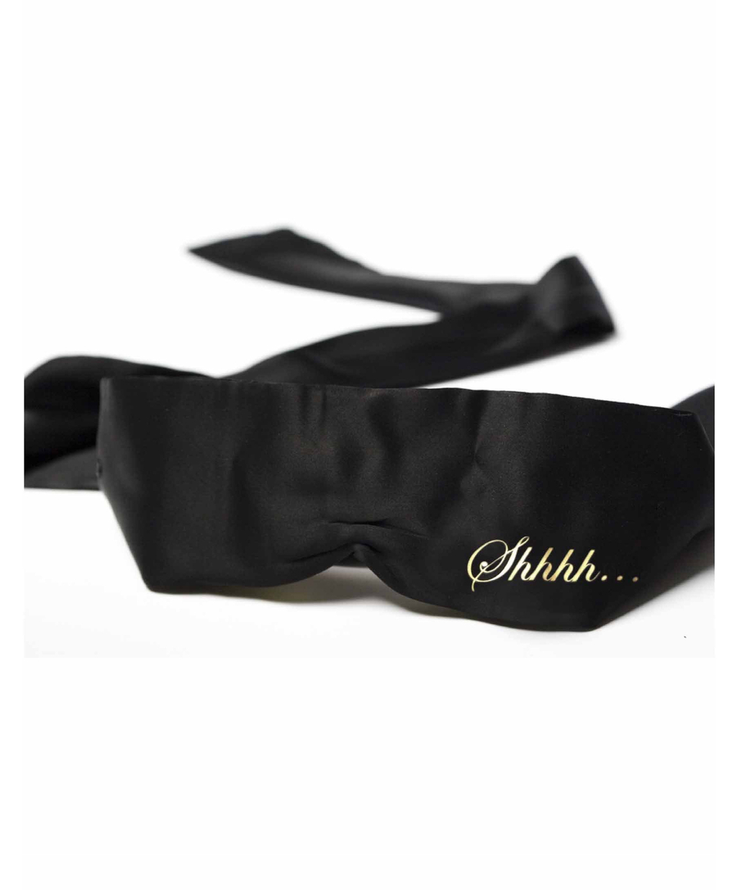 Black satin blindfold with Shhhh… printed in gold on one side and Oooooh! in silver on other side.