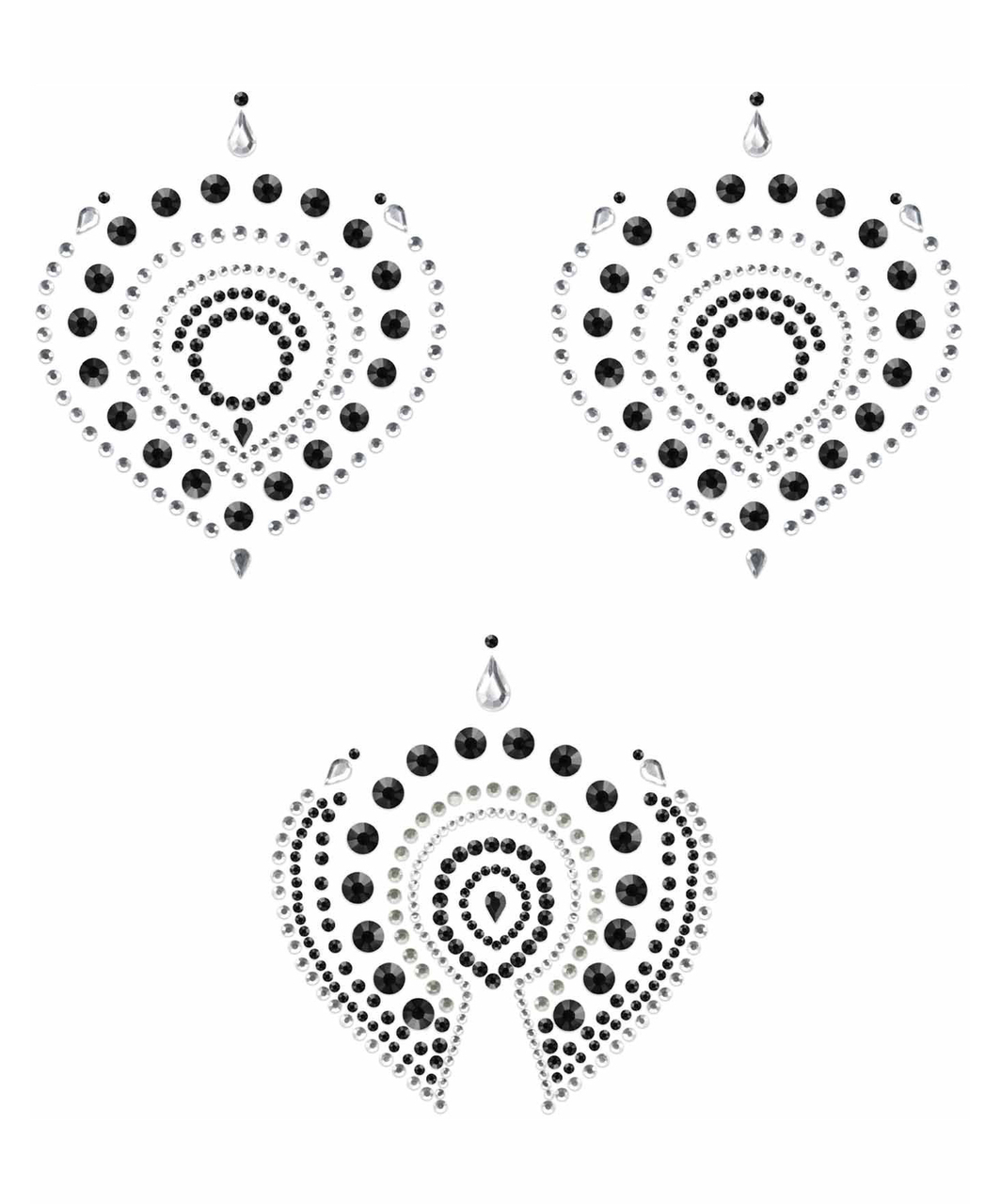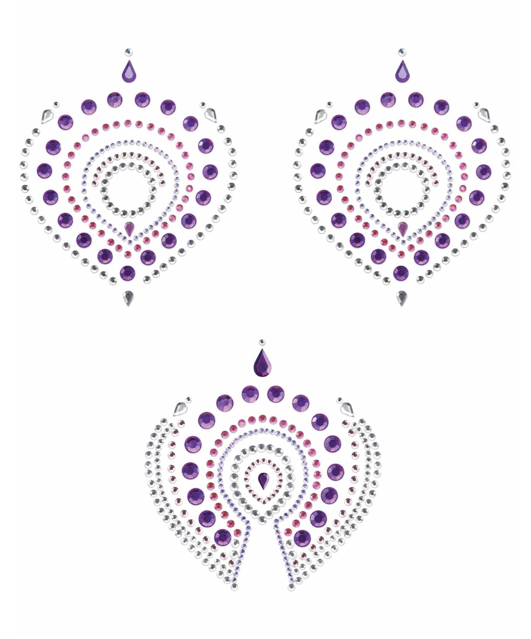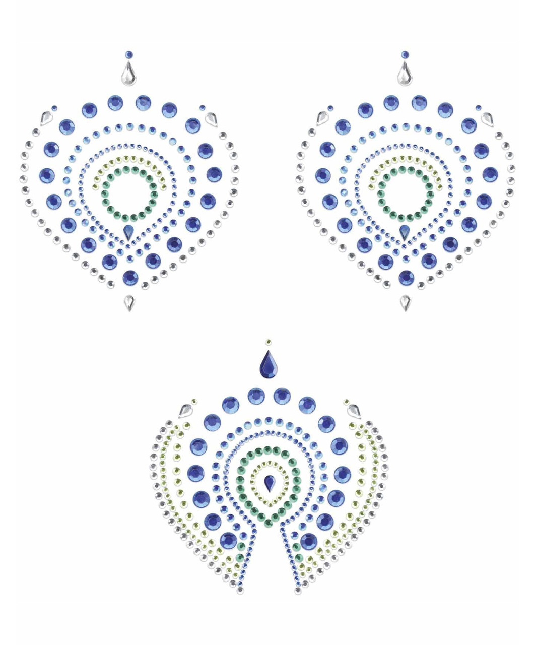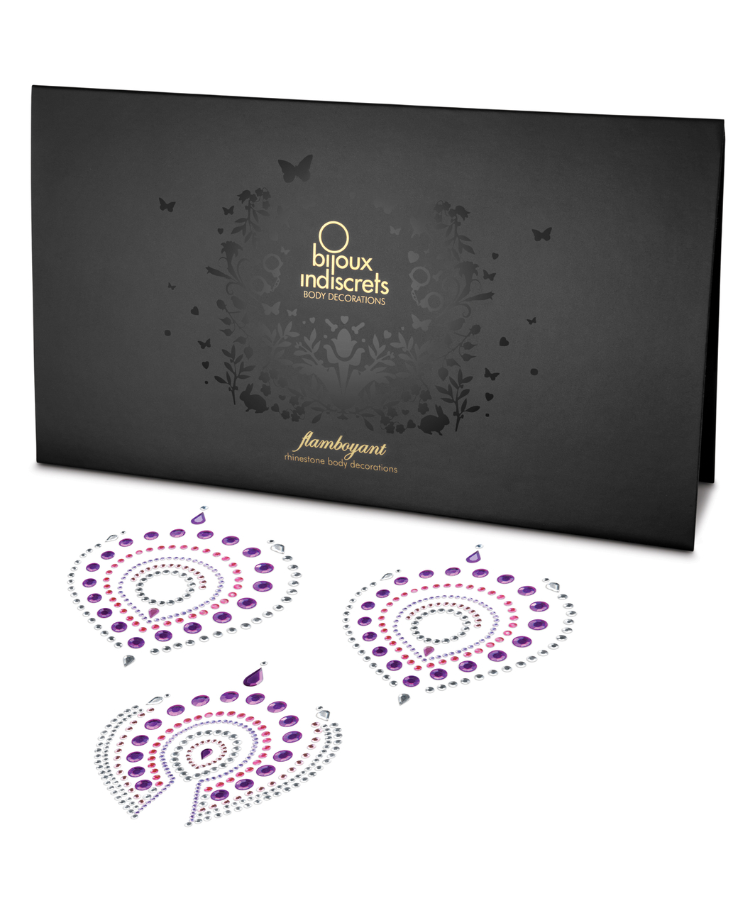 Self-adhesive rhinestone body decorations. Celebrate your naked skin with Flamboyant’s beautiful shapes inspired by the peacock feathers. If clothes are optional your body will become a true jewel and if you wish to, combine it with your finest lingerie for unlimited seduction.