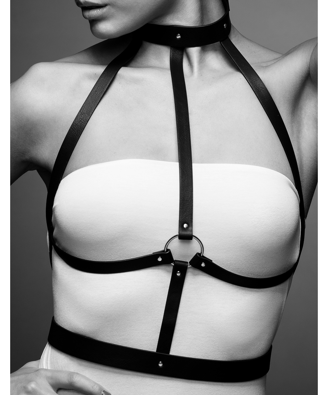 Reveal your kinkiest side and get a corset feeling with this bondage inspired harness! This light and elegant vegan leather harness will be a great addition to your captivating image or a tempting element in an erotic game with a touch of BDSM. This harness has a classic, adjustable strap closure with 9 holes on the back (intended circumference – up to 77 cm, but it is possible to make additional holes, increasing the circumference to 91 cm). The neck strap also has a classic, adjustable strap closure with 6 holes (maximum neck circumference – 39 cm).