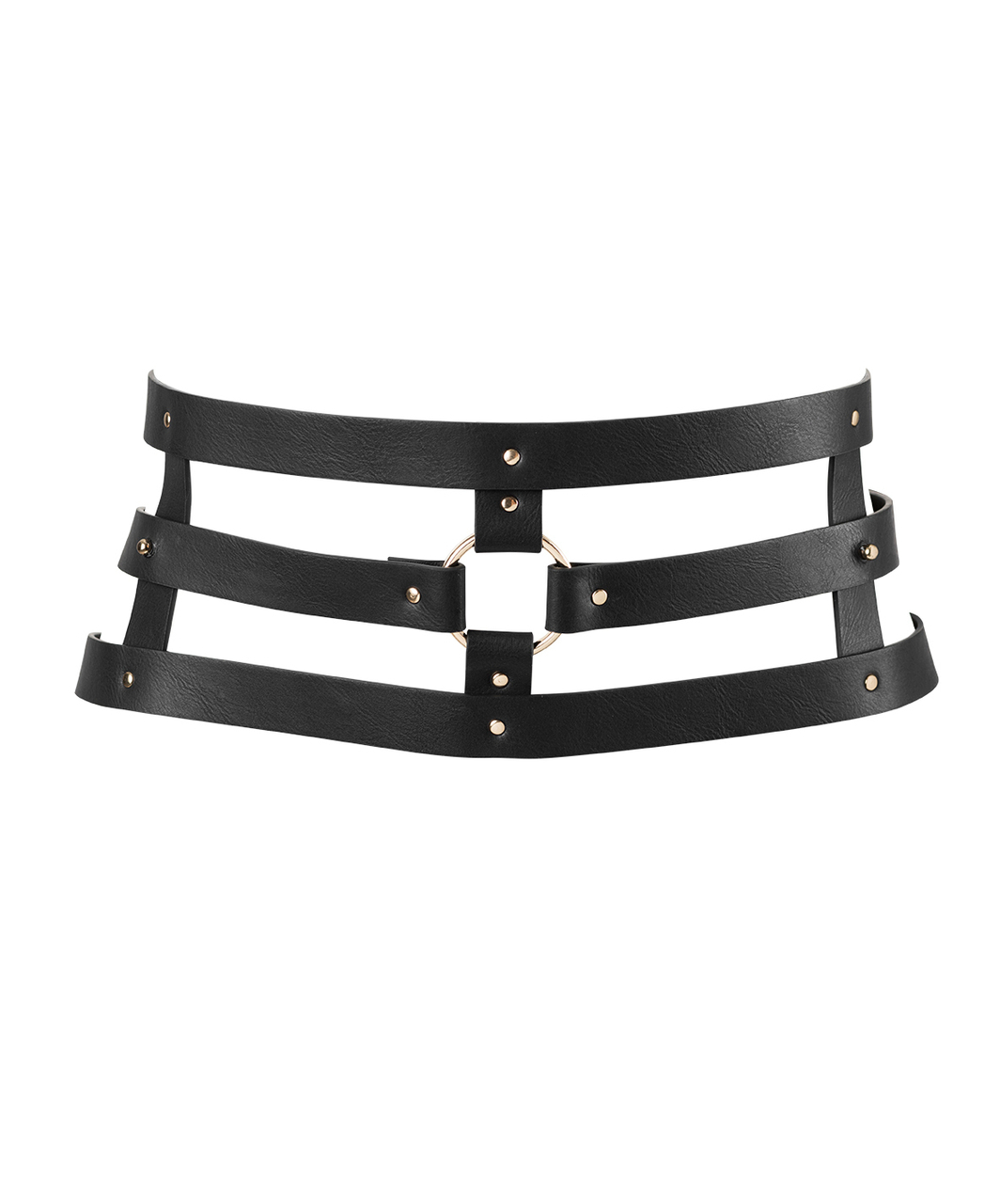 The strap in the middle of this accessory hides a secret: unfasten it from your waist to discover. First, unfasten this strap from your body, as you can see, it divides in two; unfasten the extender from the left-hand strap. Keep unfastening both sides equally (left and right) from the vertical straps in the front part of the belt. Fold over the straps that are now only attached to the front ring and pass them through the ring from the inside towards the outside. Fasten the extender (that you unfastened at the beginning from the left- hand strap) to the rings of the straps. Put your hands in the ‘handcuffs’ you have just made and let them guide your movements with the strap attached to the loop. You have just turned your belt into a restraint.
