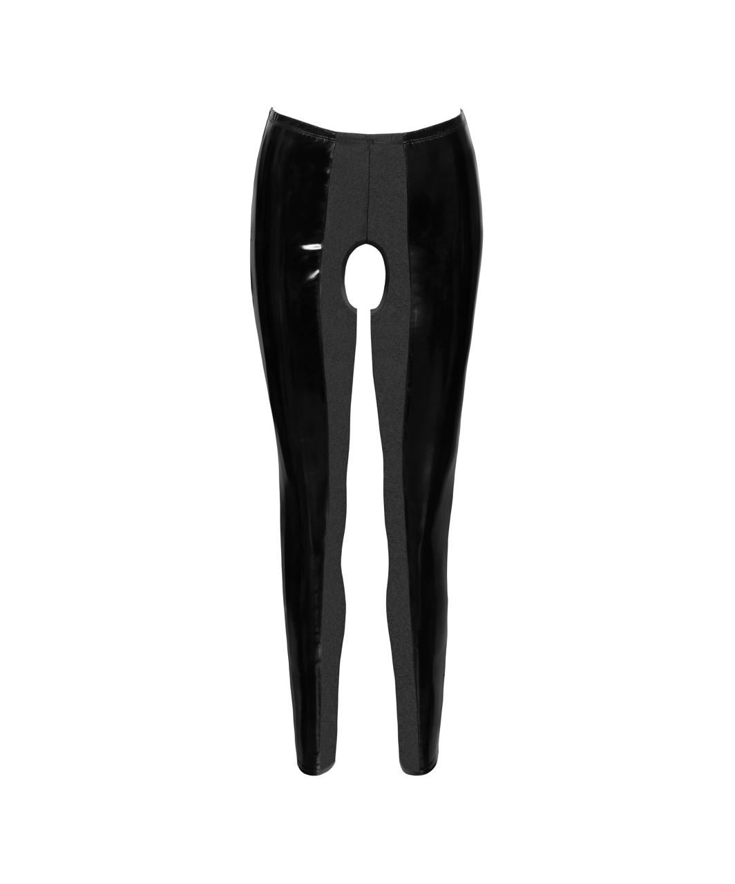 Balck crotchless sheen vinyl leggings. Inseam and crotch made of stretchy fabric which provide a skin-tight fit and make them comfortable to wear.