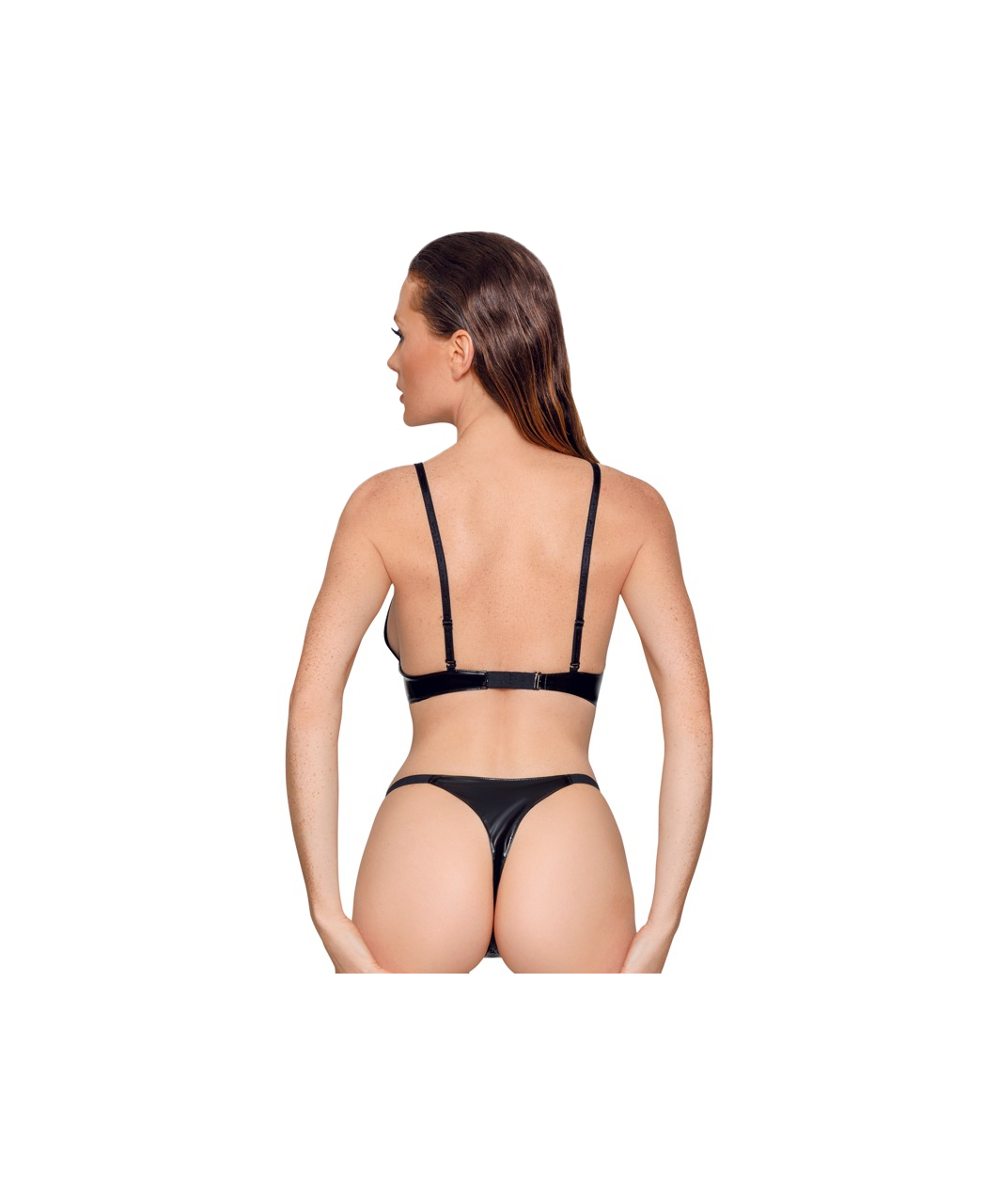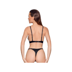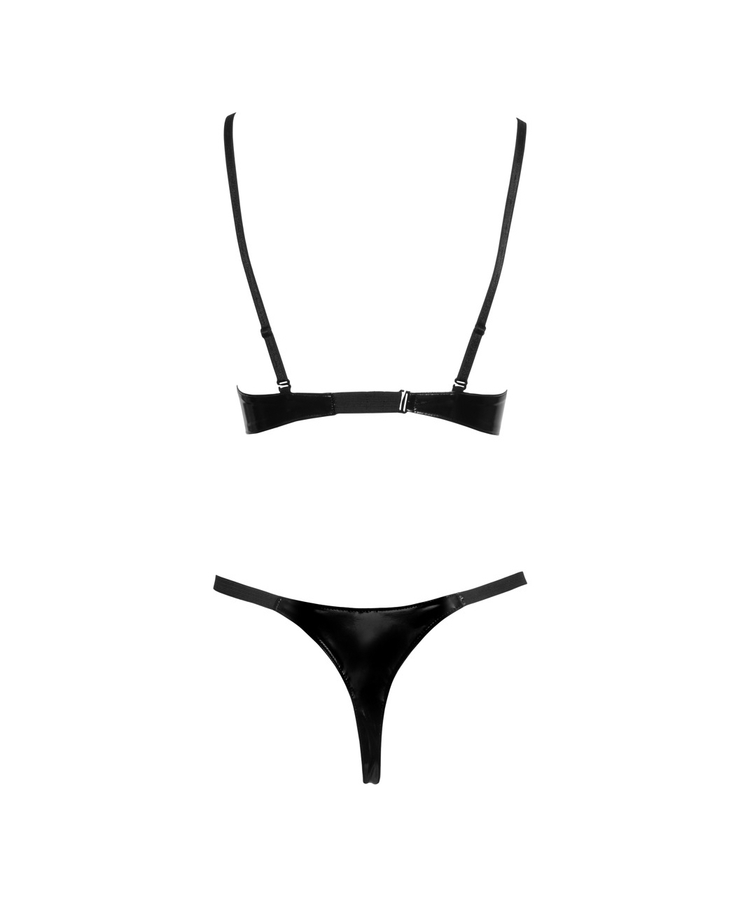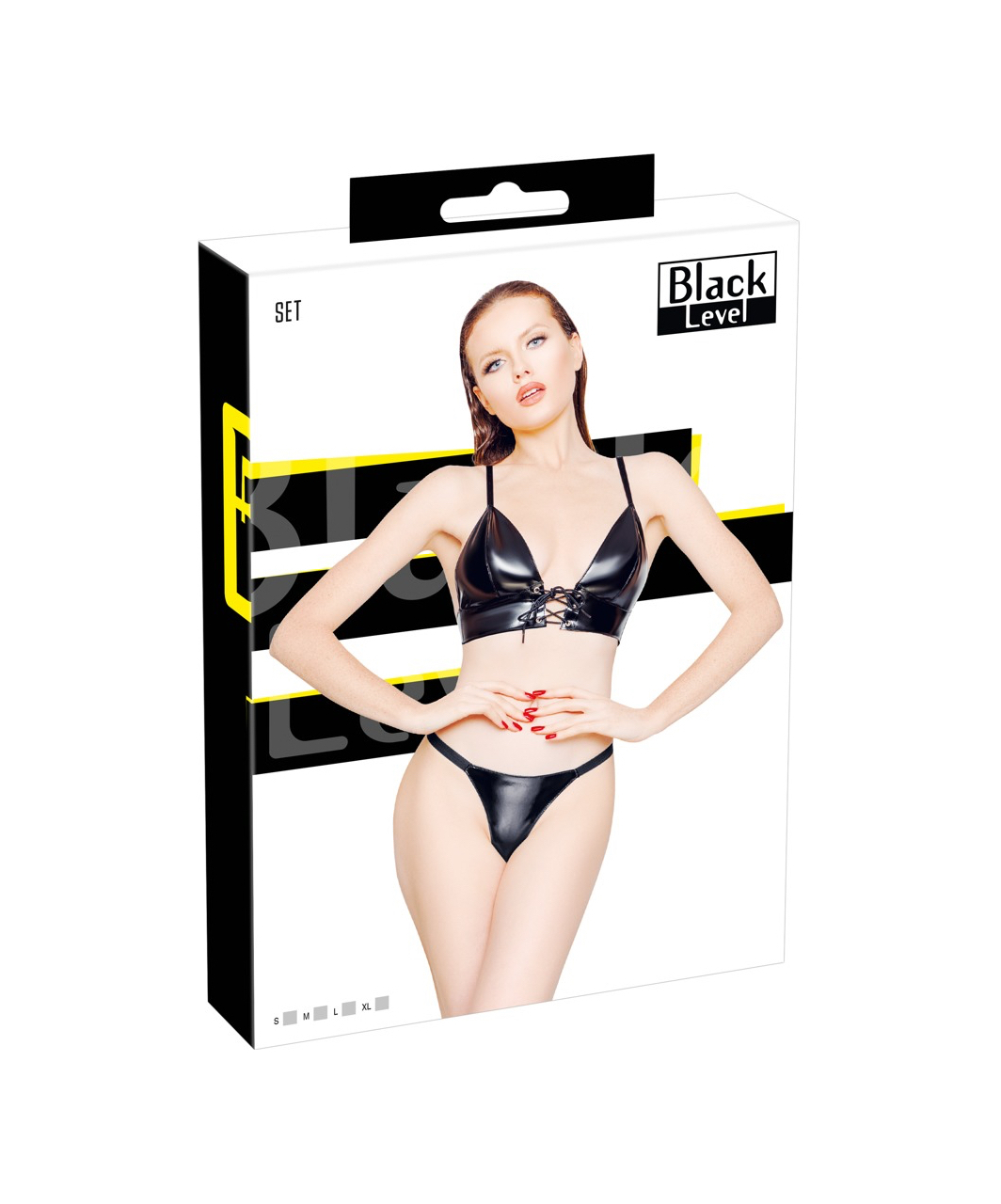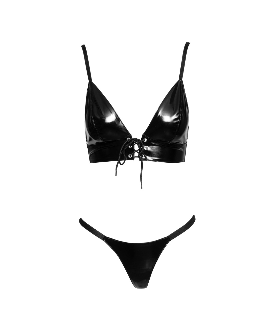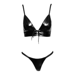 Black vinyl lingerie set – the lace up bralette and matching G-string. Bralette has back elastic and hook closure.