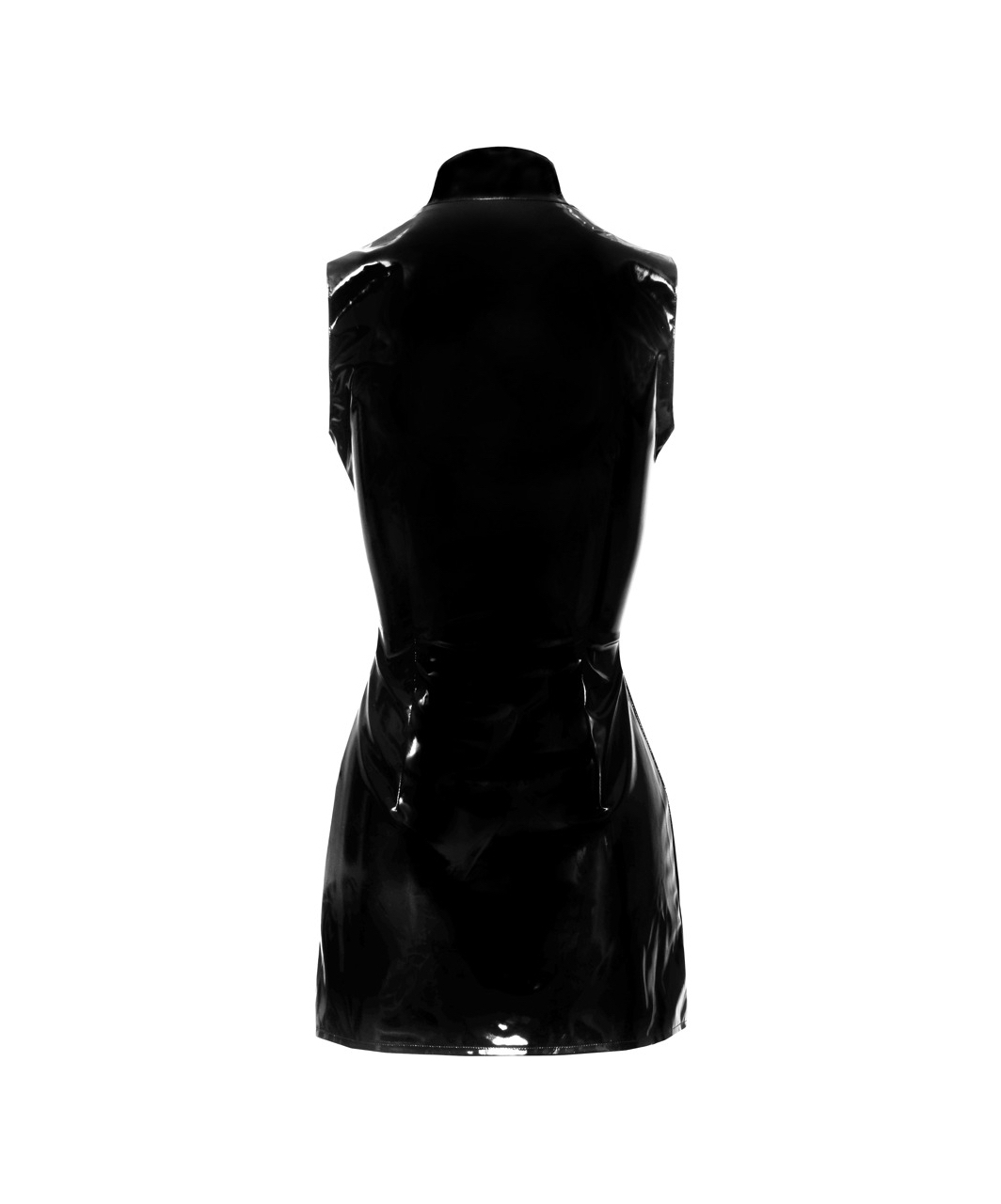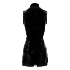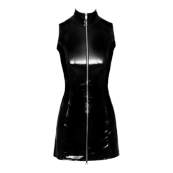 This black vinyl mini dress can be worn various ways – you can decide whether you want to zip it up with the full-length, two-way zipper at the front so you can wear it like a high-neck dress or whether you want to unzip it a bit to allow cheeky glimpses. This is how you can turn this sleeveless shirtdress into a shiny low-cut outfit in the blink of an eye with some hot accessories!