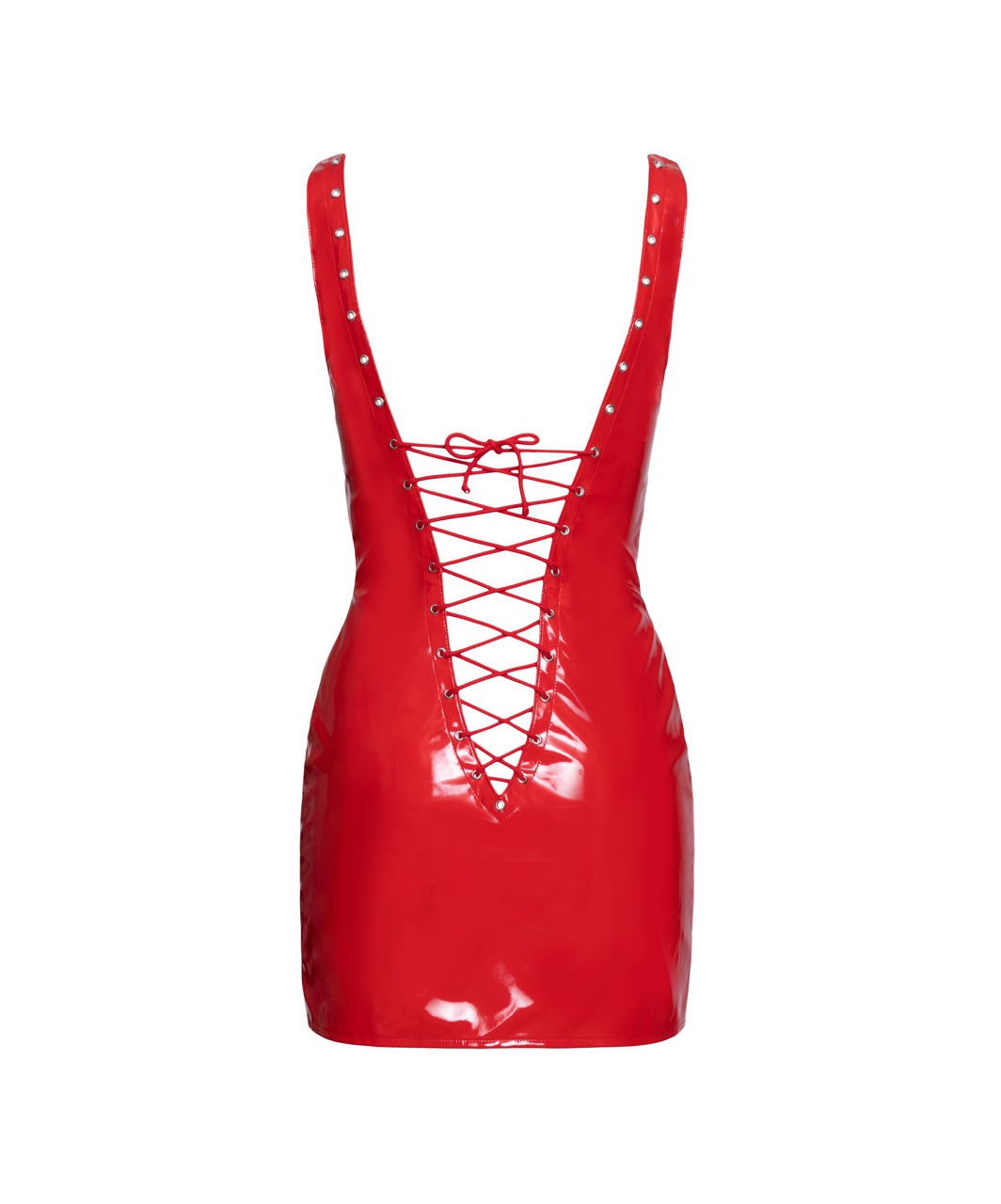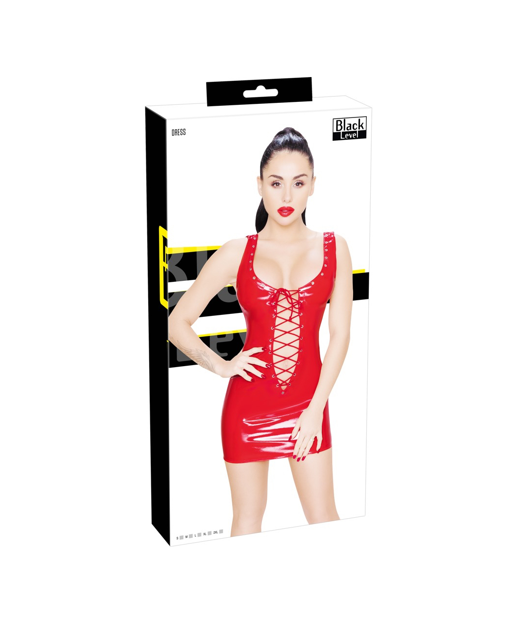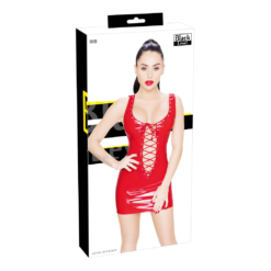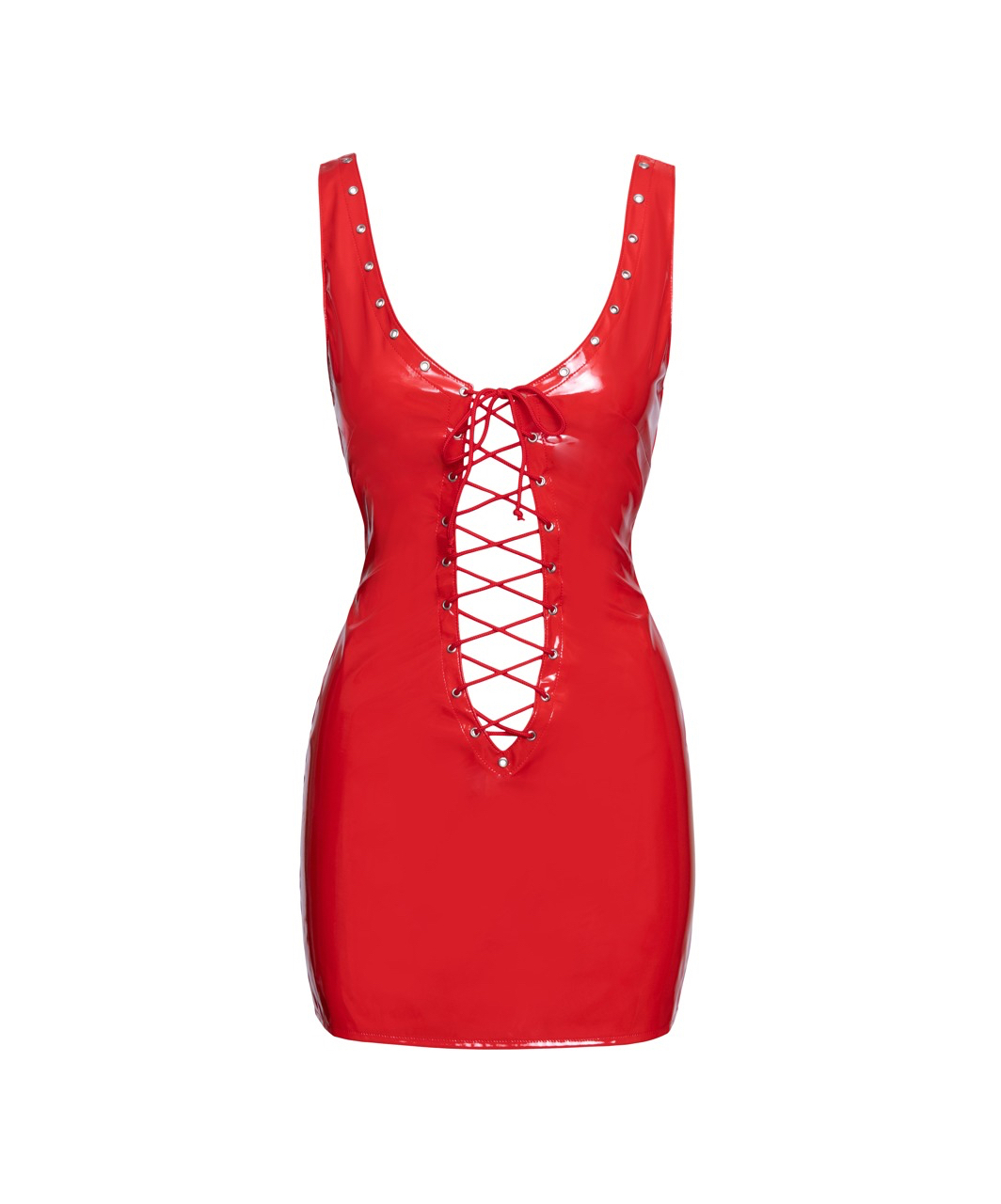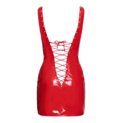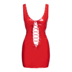 Glaring red vinyl dress with deep plunging lacing tie-up neckline and lace-up back.