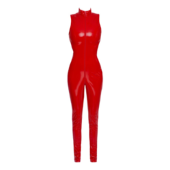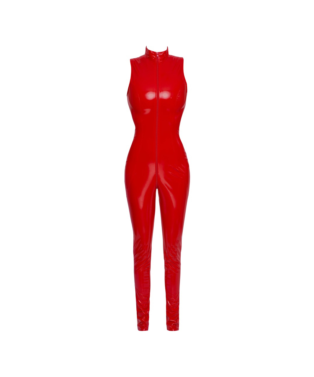 Red vinyl sleeveless jumpsuit with full length two-way zipper.
