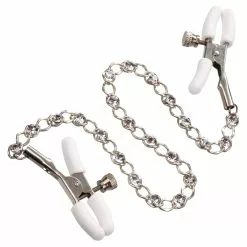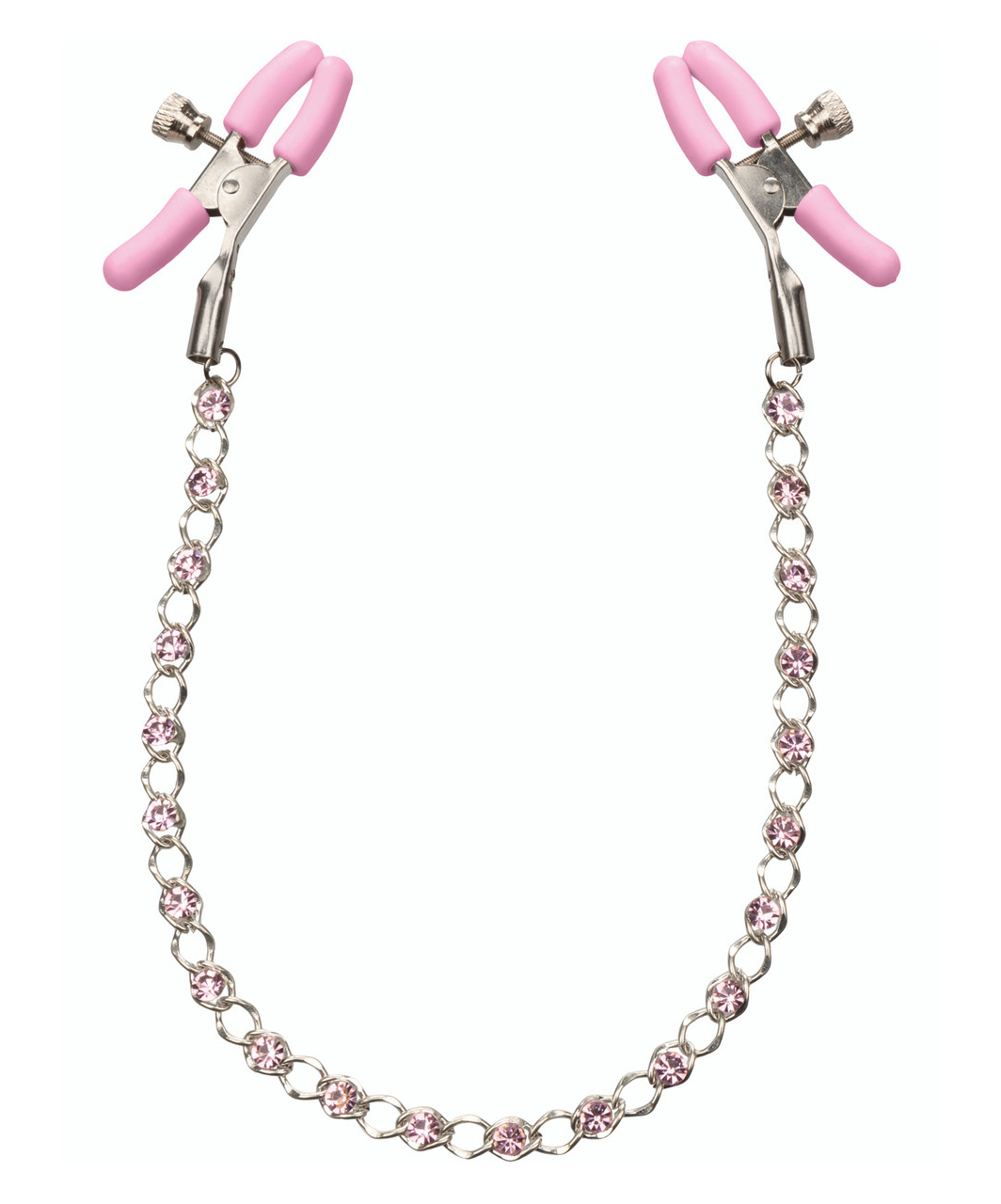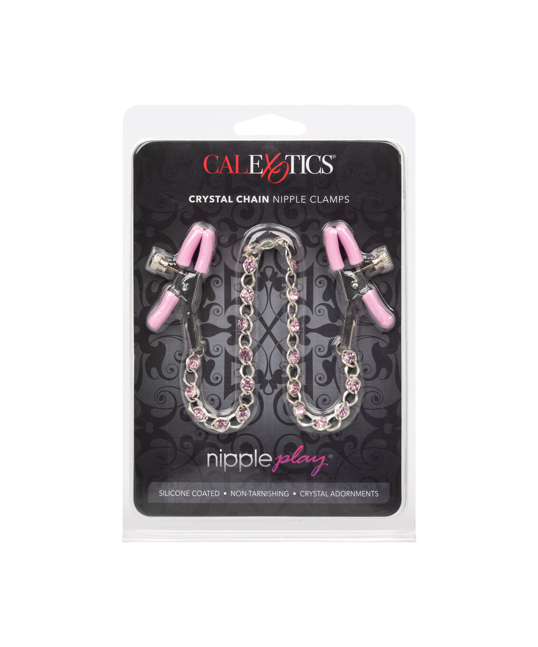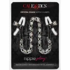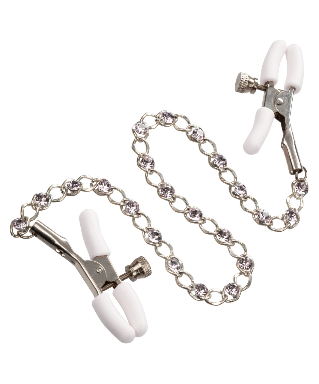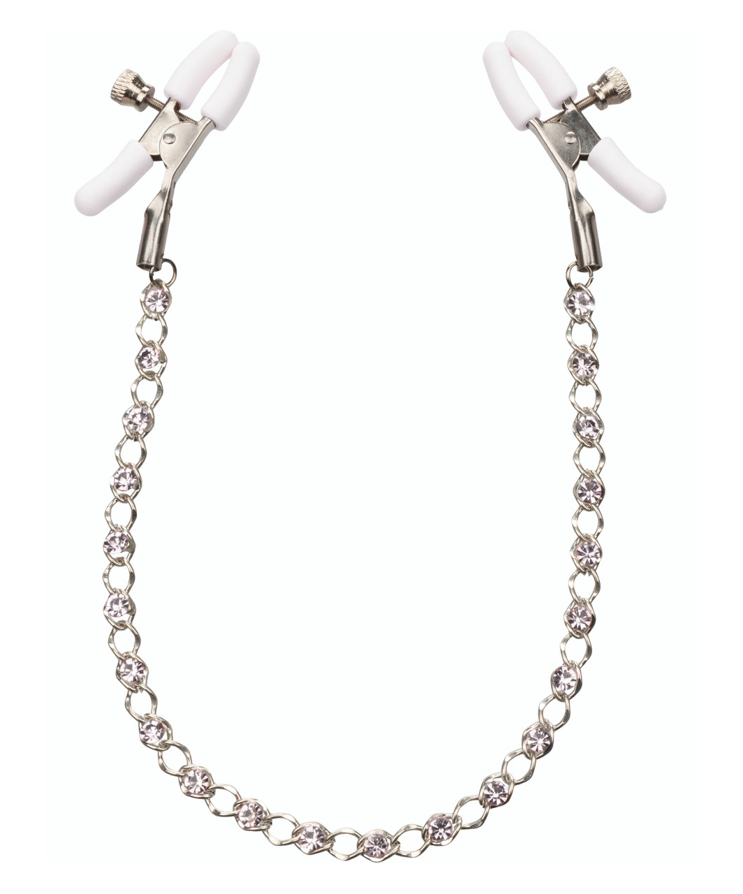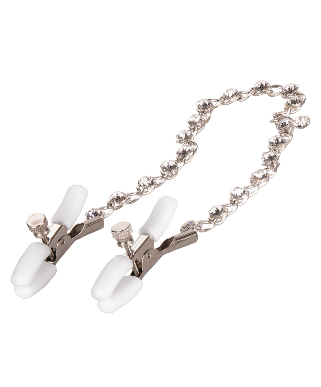 Metal nipple clamps connected by a chain which is decorated with sparkling crystals. The clamps have silicone tips.