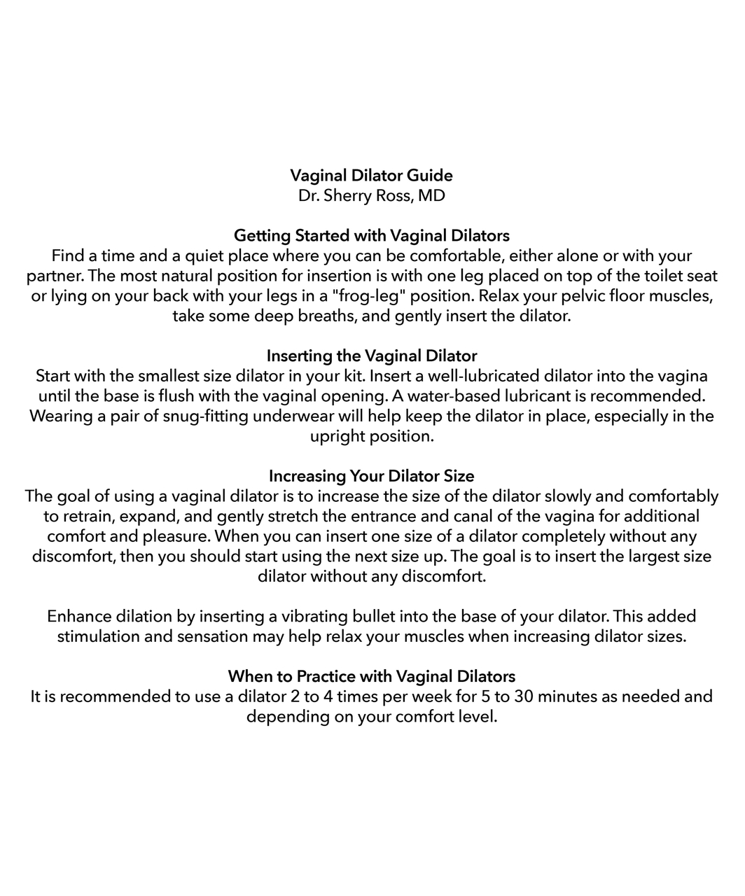 Wear comfortable snug underwear to ensure the dilator stay in place during the procedure. Before you insert the dilator, moisten the vaginal opening with a water-based lubricant and massage it gently for 2–3 minutes. Slowly insert the smallest dilator into the vagina then remove. Repeat this while observing the sensations of the body. If you feel comfortable with the chosen size, leave the dilator in the vagina and proceed with your daily routine. The duration of use is up to 30 minutes a day. The dilator should be used 2–3 times a week. Use the dilators one by one, starting with the smallest. The next size should only be used when the muscle response does not cause discomfort. After use clean the dilator in warm water with mild soap or use a suitable sex toy cleaner.