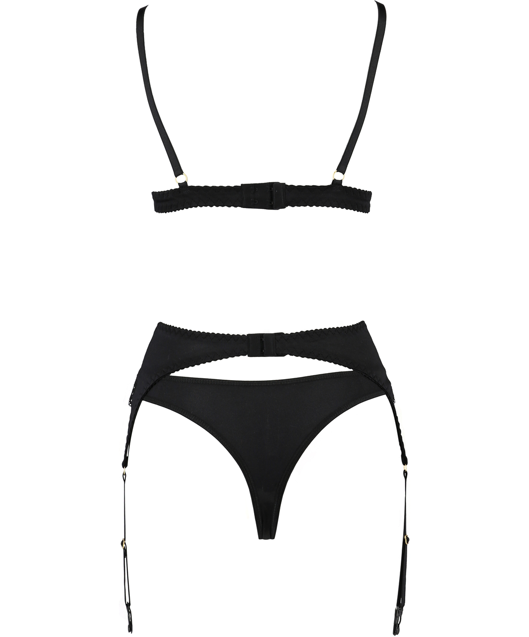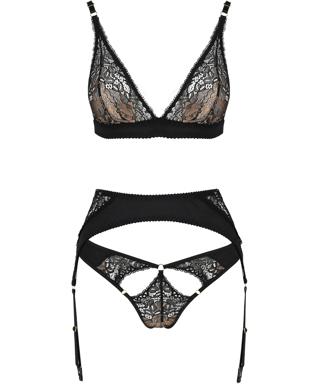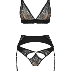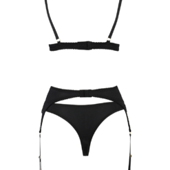 Black lace and satin lingerie set with a bralette, suspender belt and thong. The lace is decorated with golden lace patches. The bra and suspender belt has three-row hook closure on the back; the length of the straps can be easily adjusted.