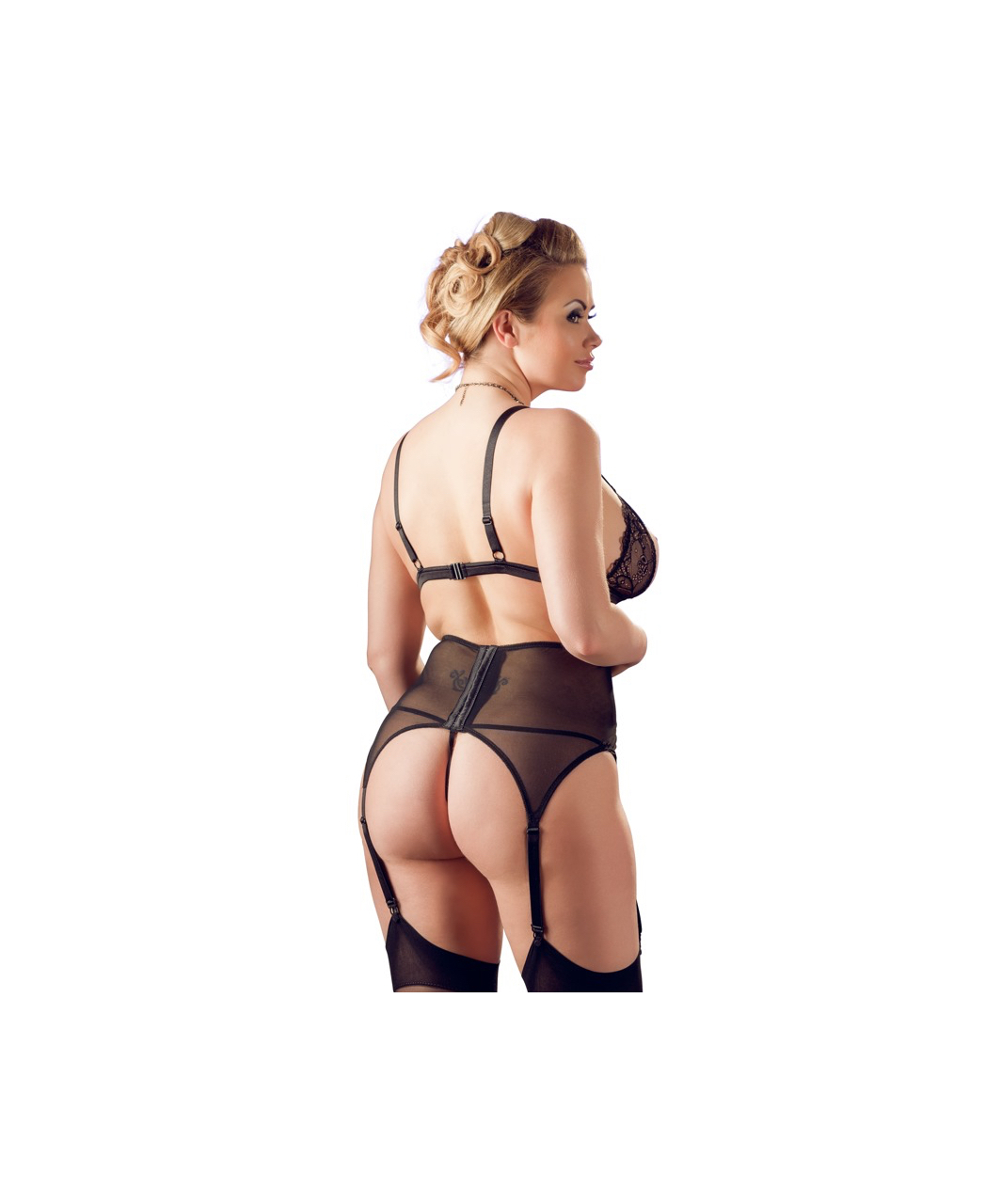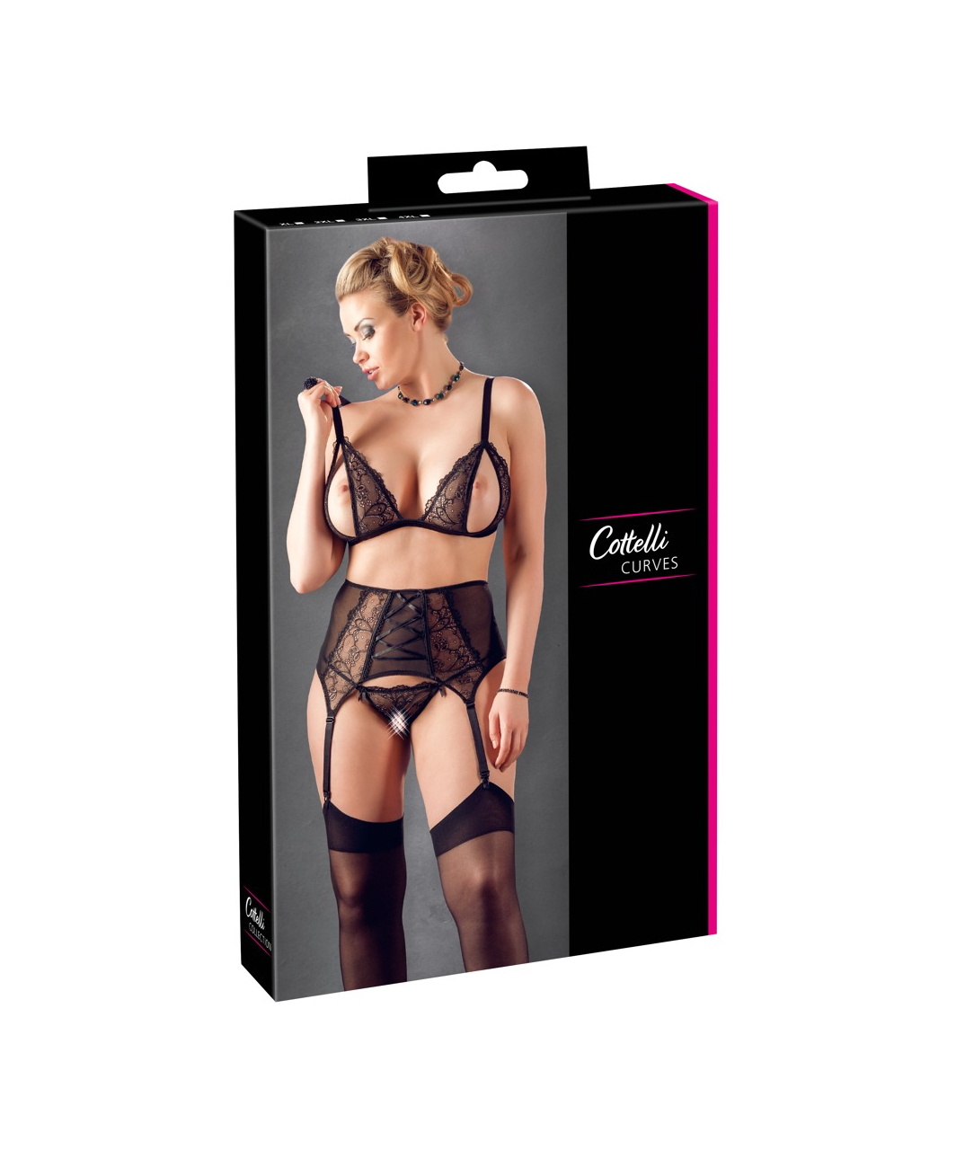 Soft bra with open cups, adjustable straps and hook closure in the back. Suspender belt with decorative lacing and four adjustable straps. Matching string enclosed. 90% polyamide, 10% elastane. Without stockings.