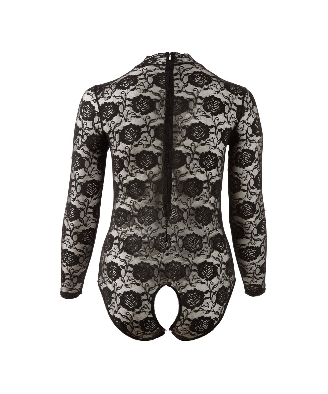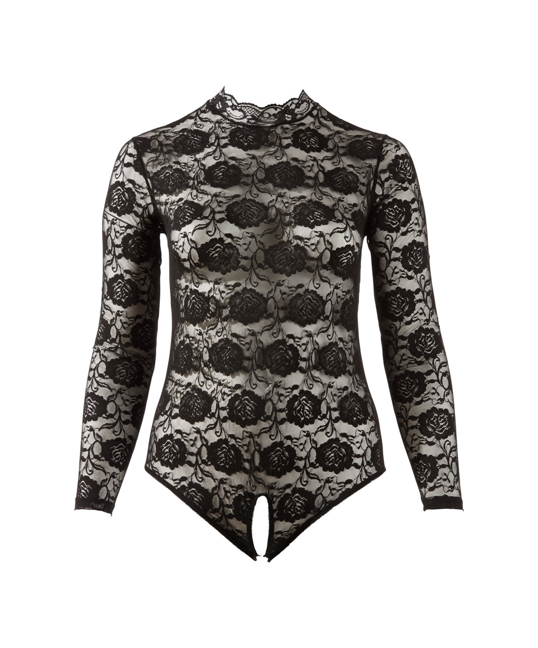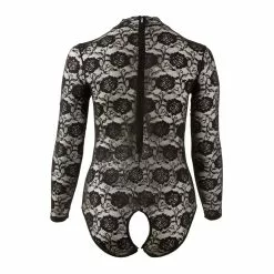 Black bodysuit with long sleeves, short stand-up collar and open crotch. Completely made of lace.