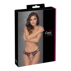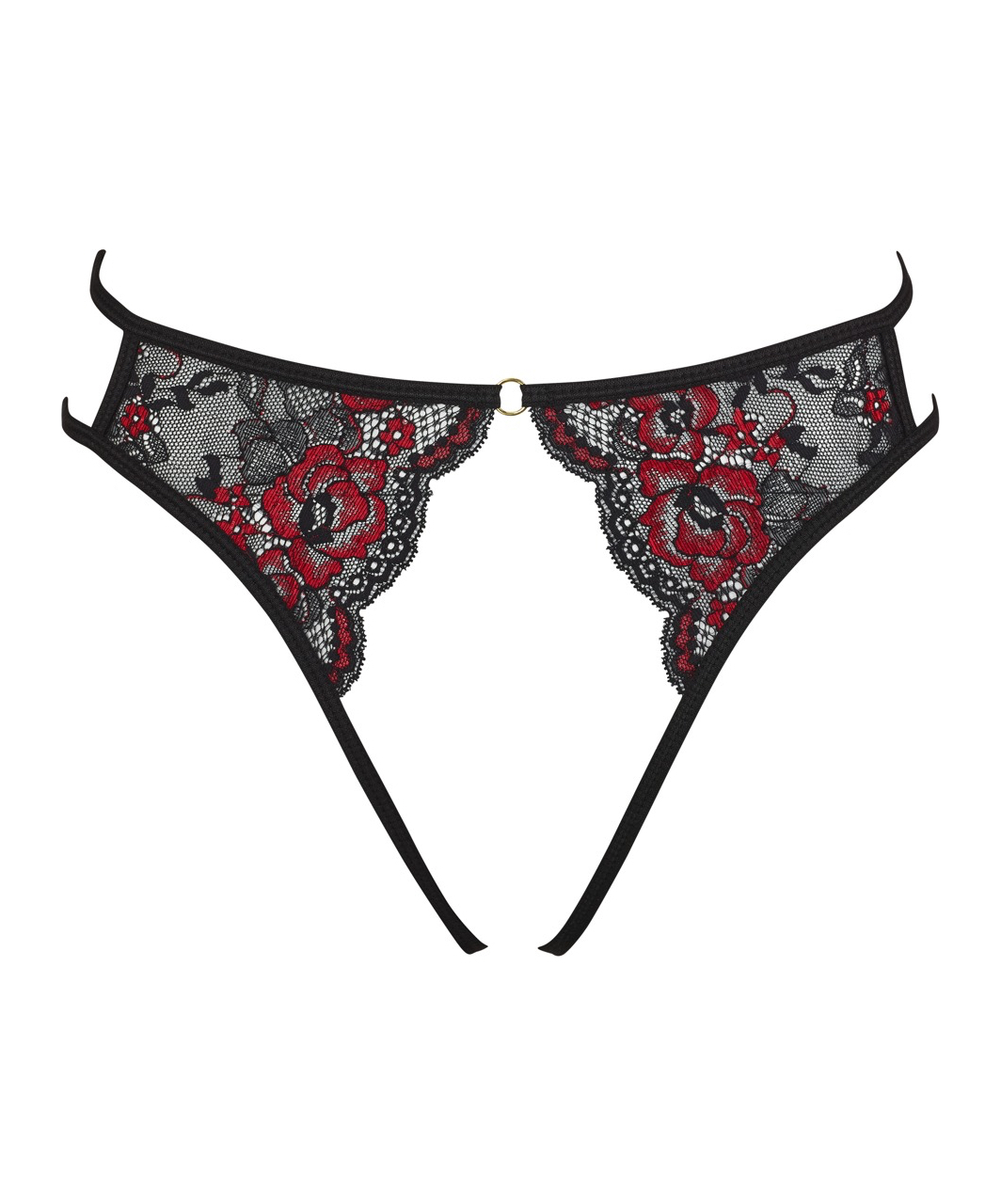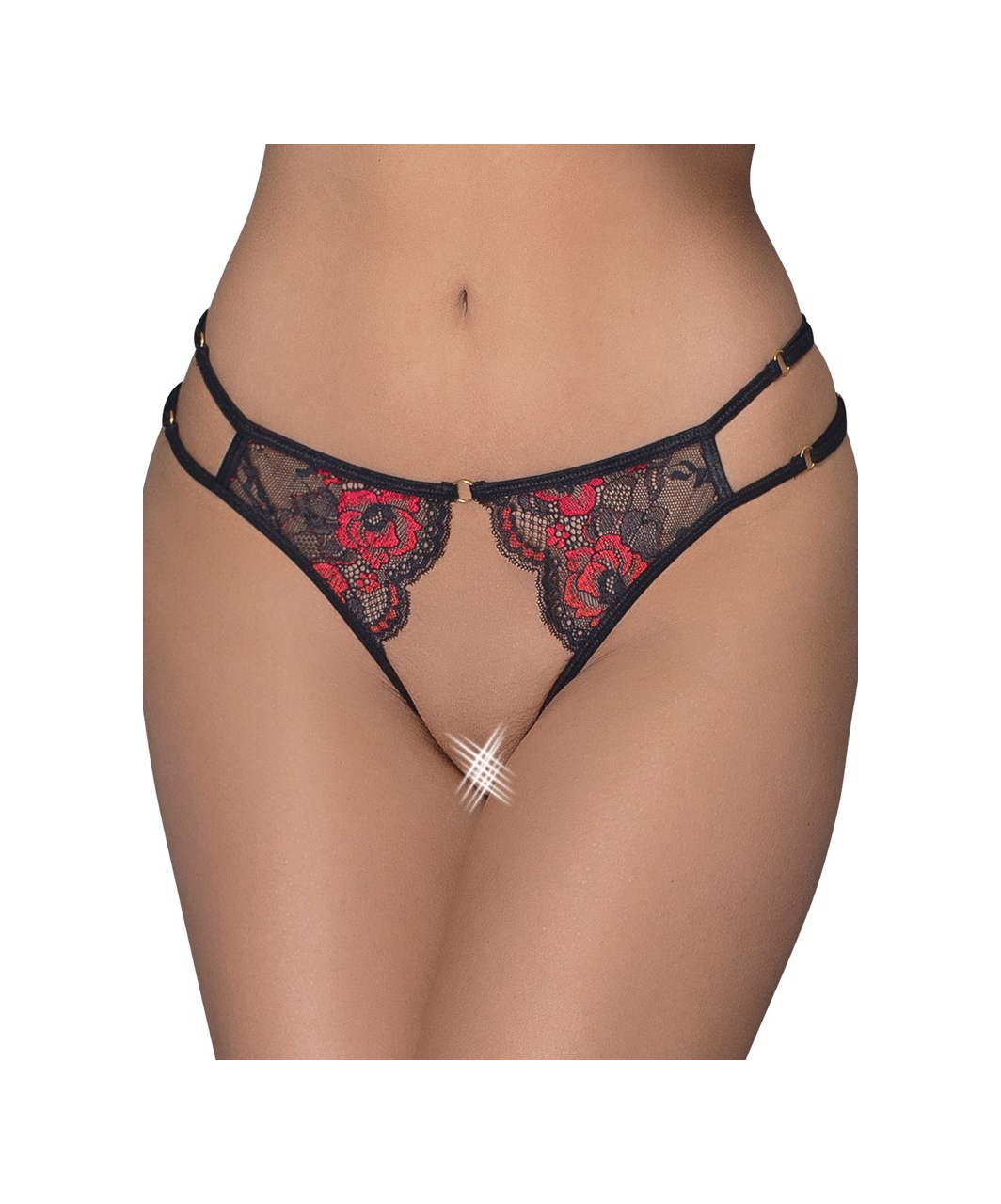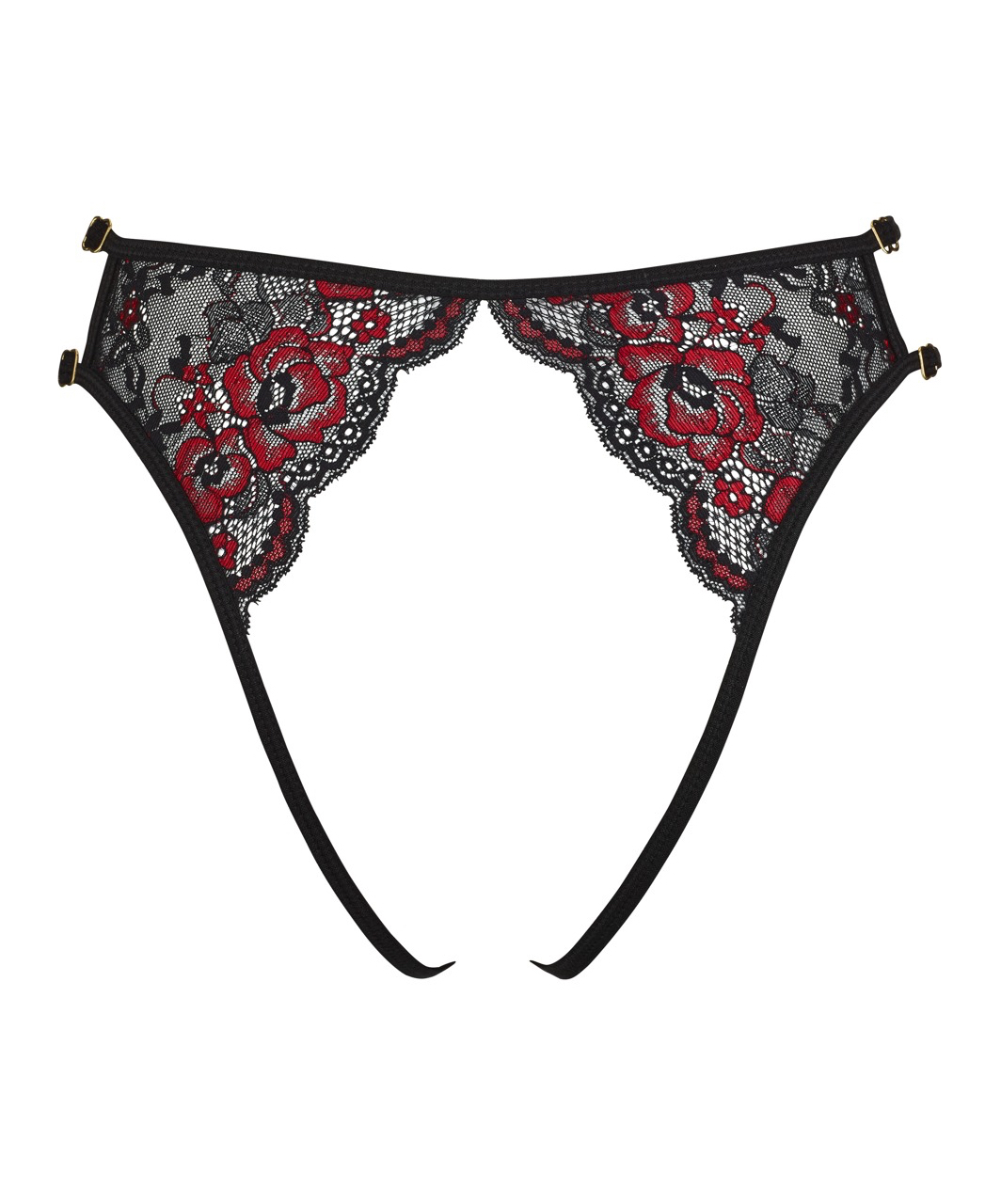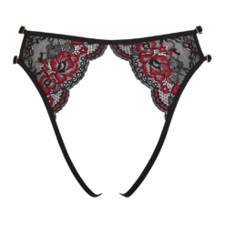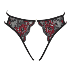Crotchless string made of black lace with red floral embroidery. Unisize (S–L).