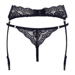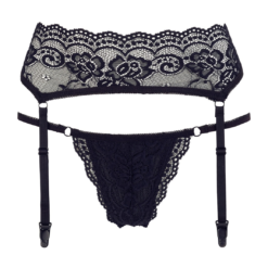 Black lace string and matching garter belt with 4 suspender straps. Without stockings.