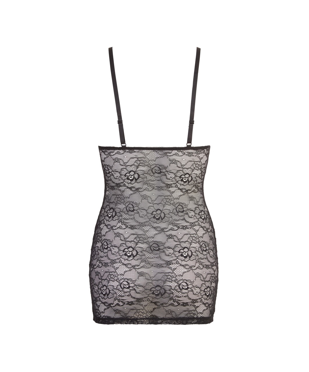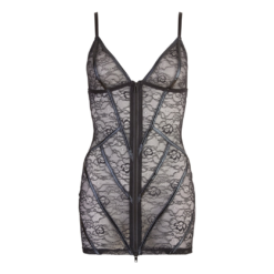 Black mini dress made of elicate floral lace with front stripes in matte look. Two-way full-length zipper, adjustable straps.